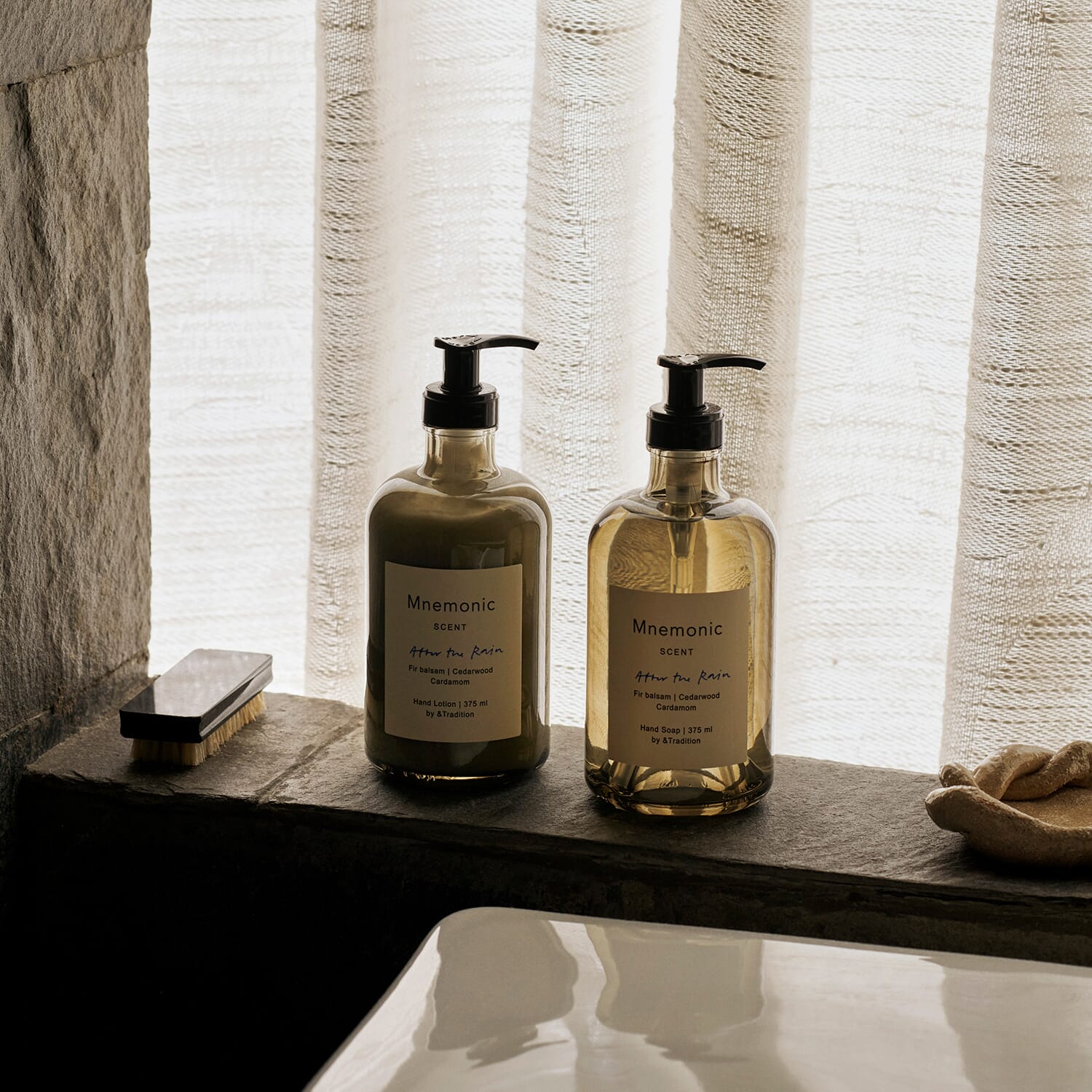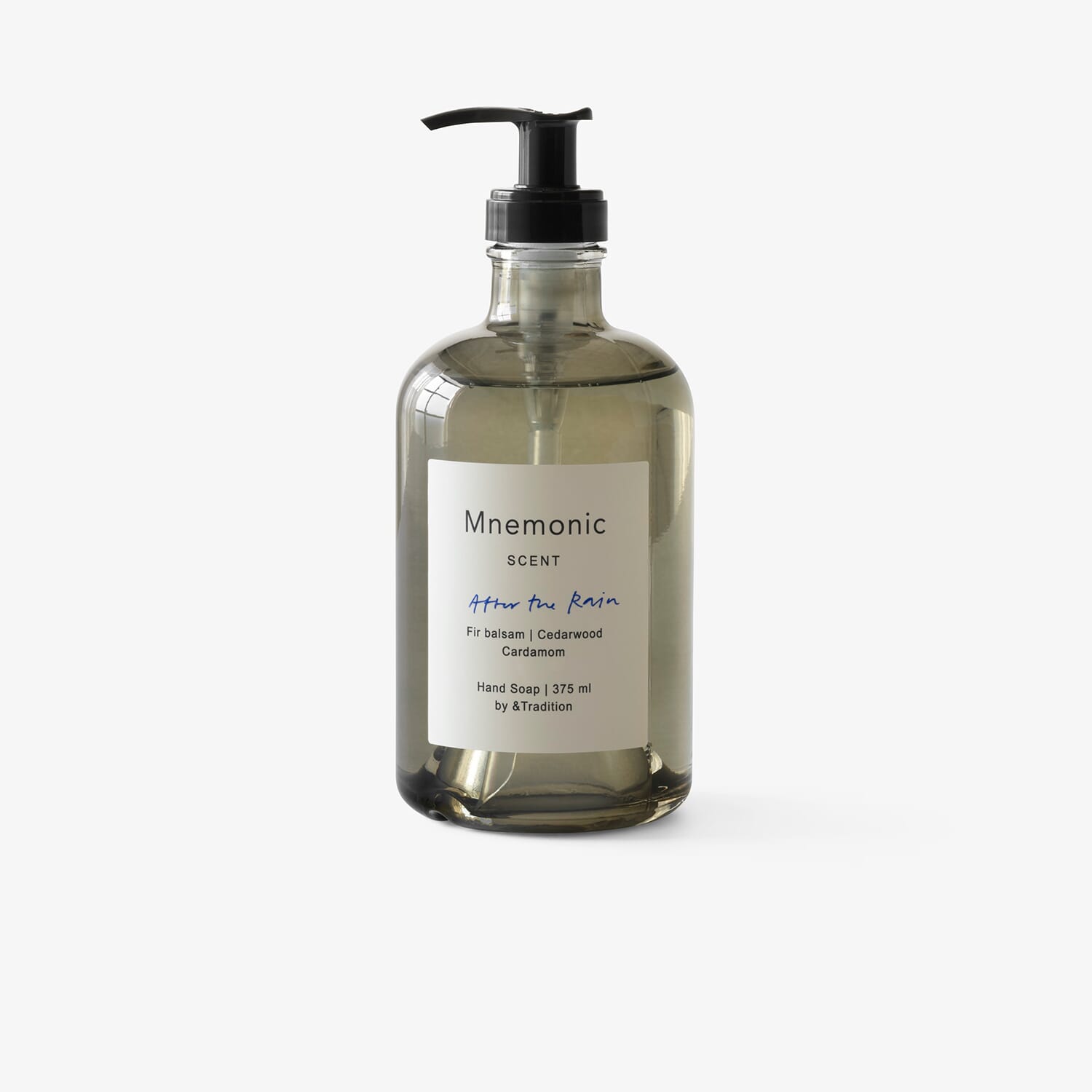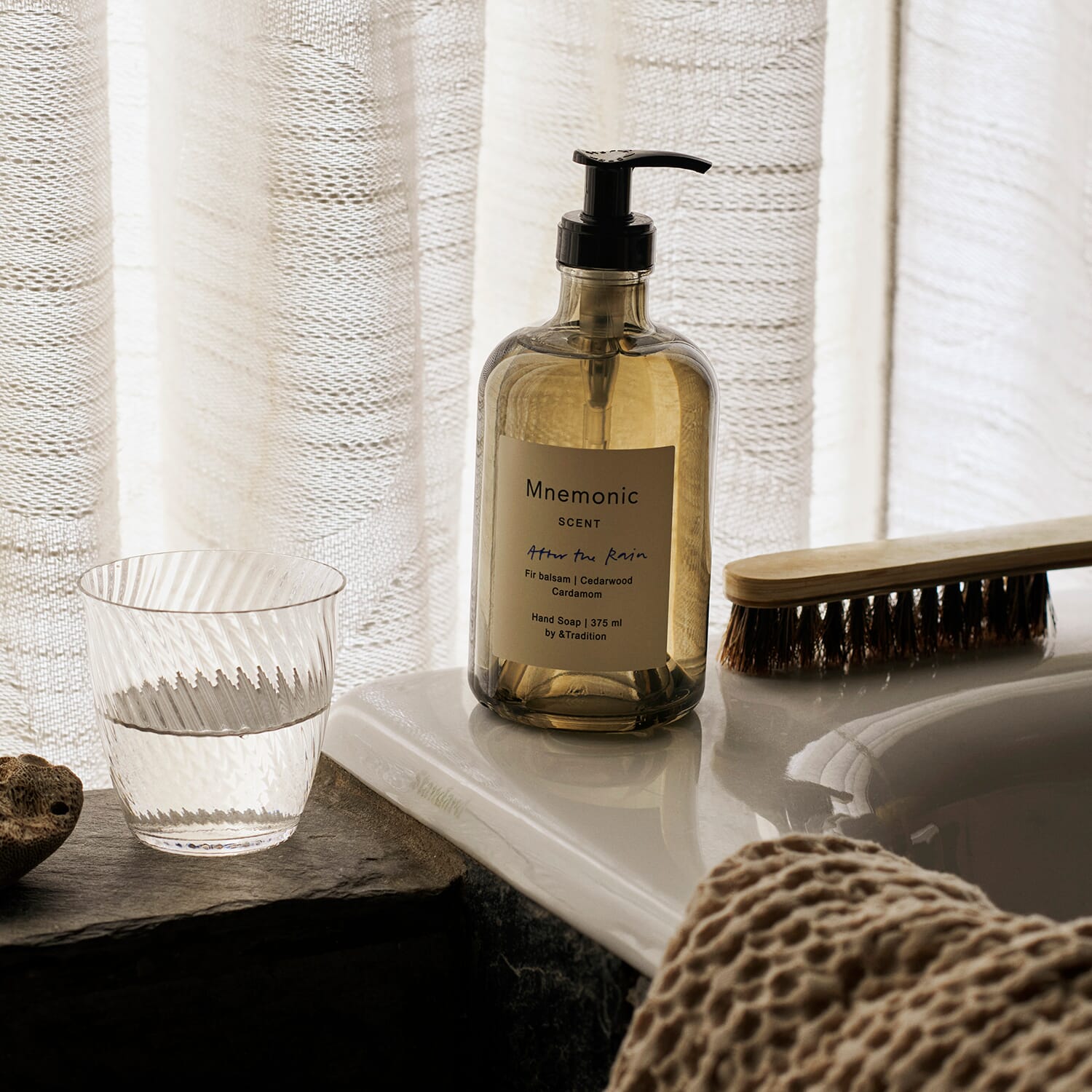 Alle produkter i Mnemonic-serien er utviklet i samarbeid med bransjeeksperter og inneholder naturlige, næringsrike ingredienser. Den flytende såpen kommer i en håndlaget glassflaske fra Italia.