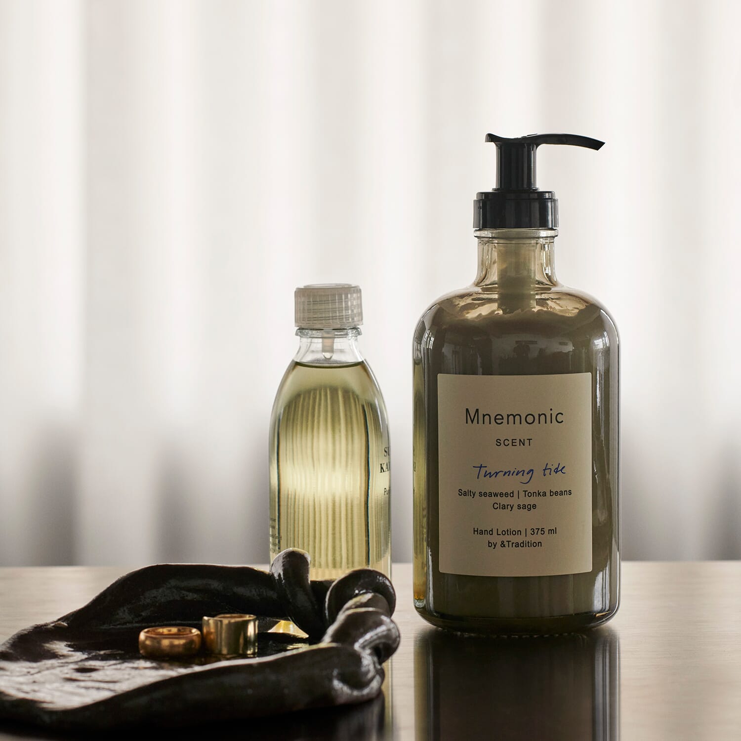 Alle produkter i Mnemonic-serien er utviklet i samarbeid med bransjeeksperter og inneholder naturlige, næringsrike ingredienser. Den flytende såpen kommer i en håndlaget glassflaske fra Italia.