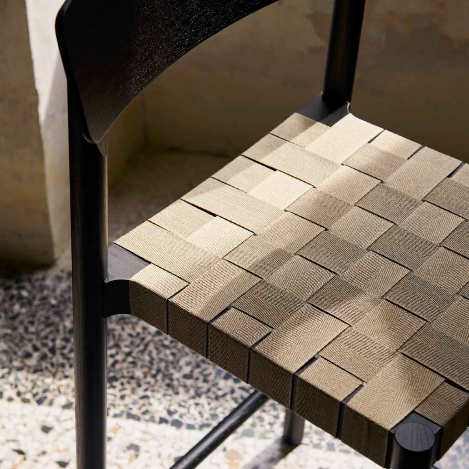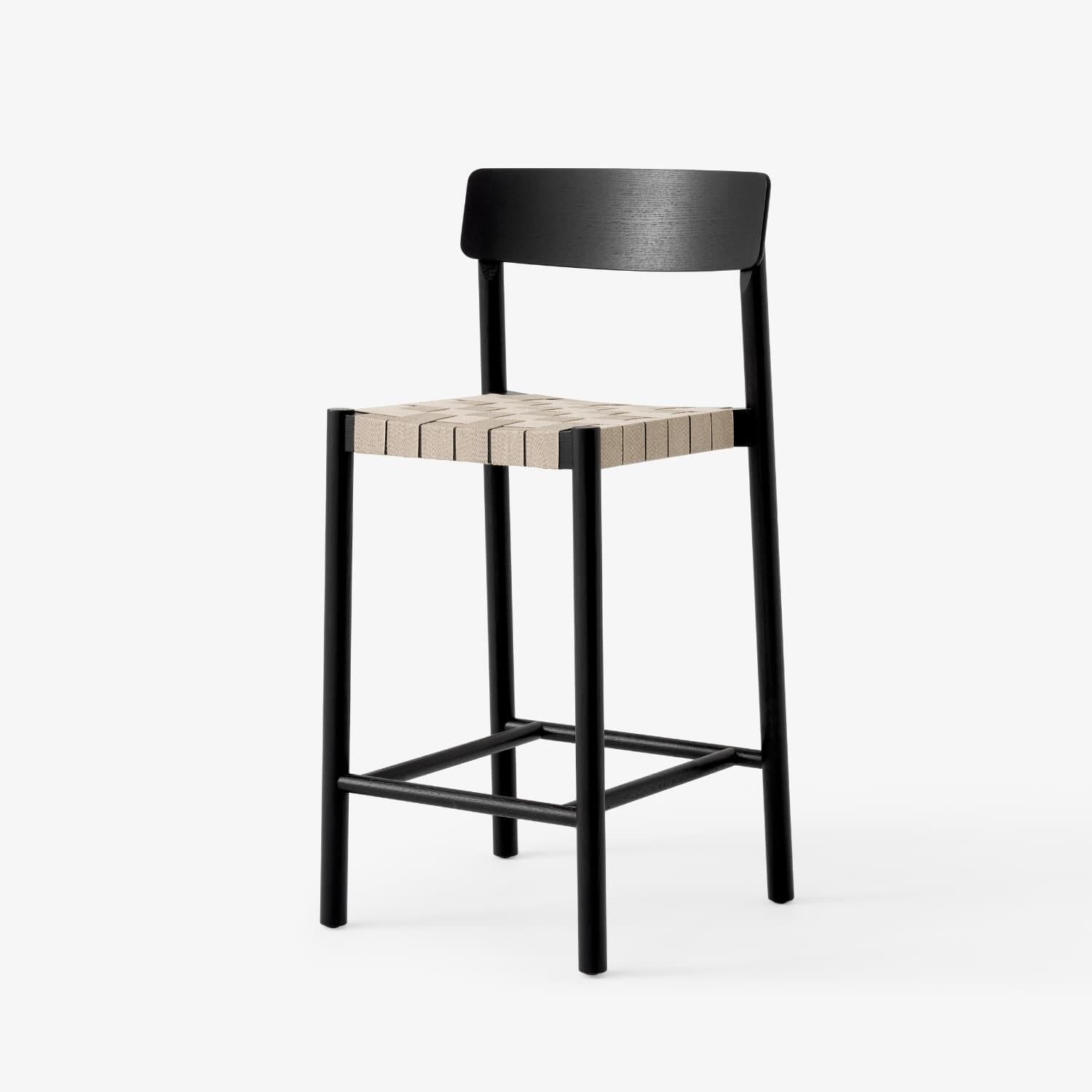 Setet er håndvevd i lin og polypropylen, her i en naturlig farget fletting som gir en varm kontrast til den svarte trestrukturen. Rammen i svartlakkert ask understreker stolens enkle linjer og skaper en harmonisk balanse mellom det elegante og det naturlige. Resultatet er en lett, men robust barstol som tåler daglig bruk.