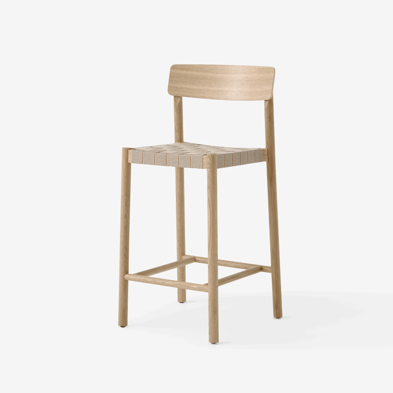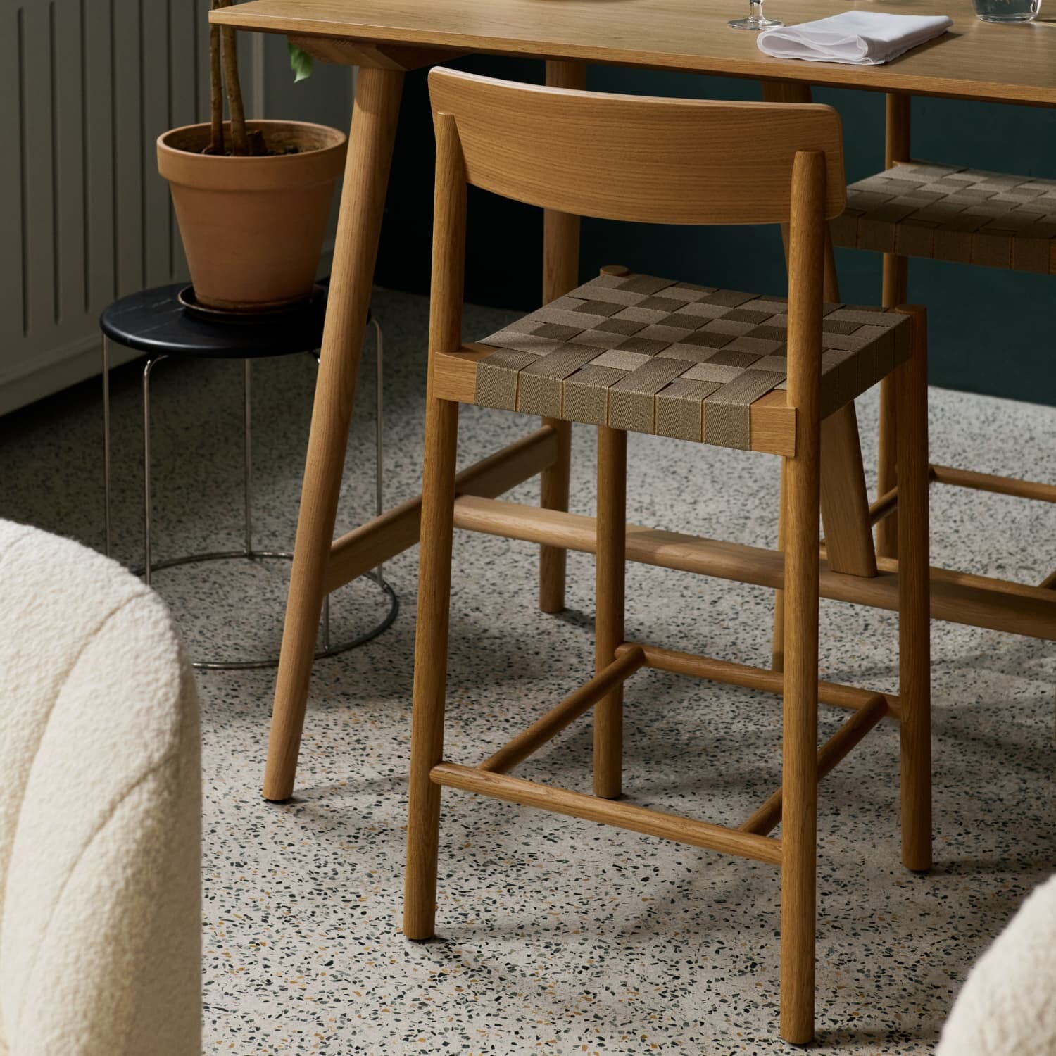 Setet er håndvevd i lin og polypropylen, og gir en slitesterk og behagelig sitteopplevelse. Den naturlige flettingen står i vakker kontrast til den solide eikerammen, som enten er oljet eller lakkert med vannbasert behandling for å bevare treets naturlige glød. Resultatet er en barstol som både er robust og estetisk tiltalende.