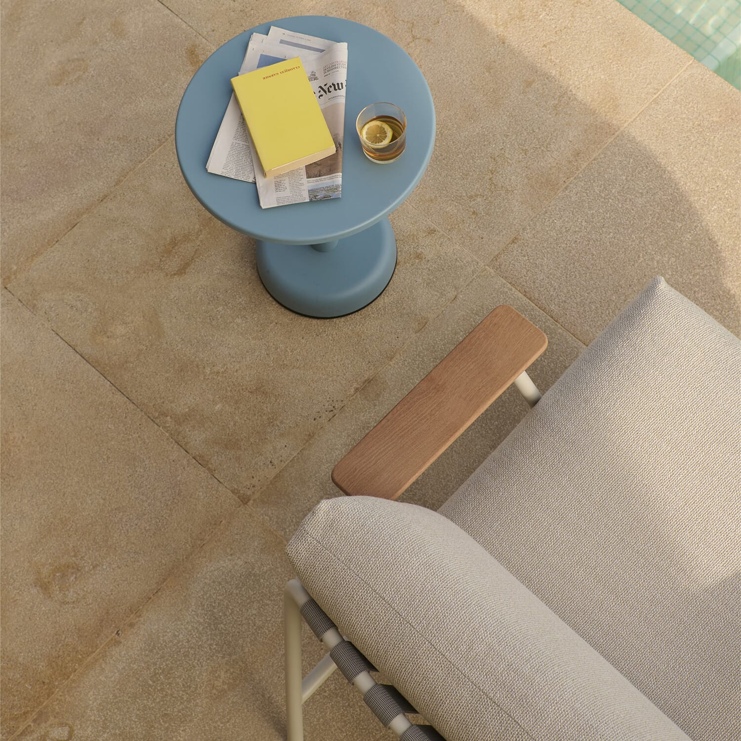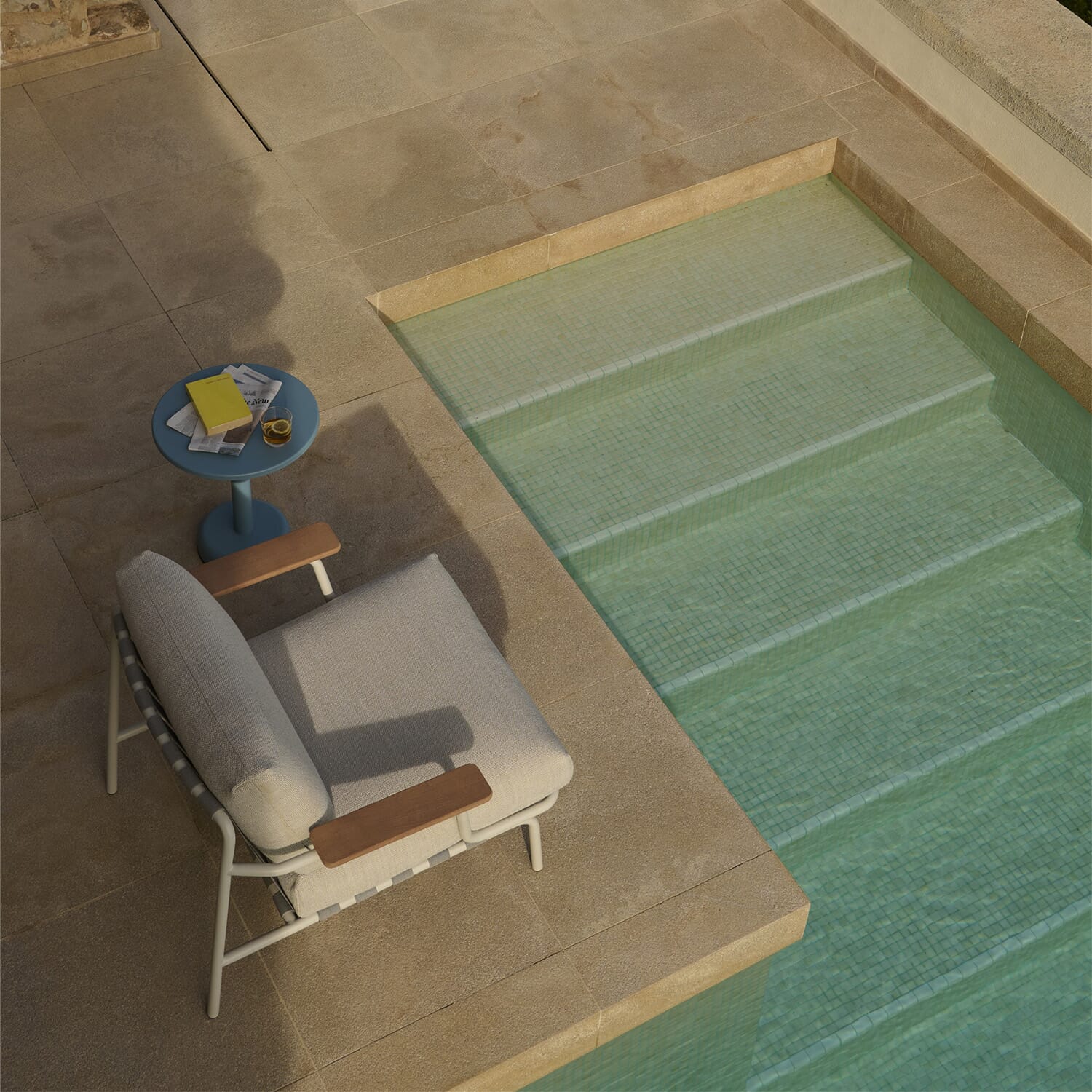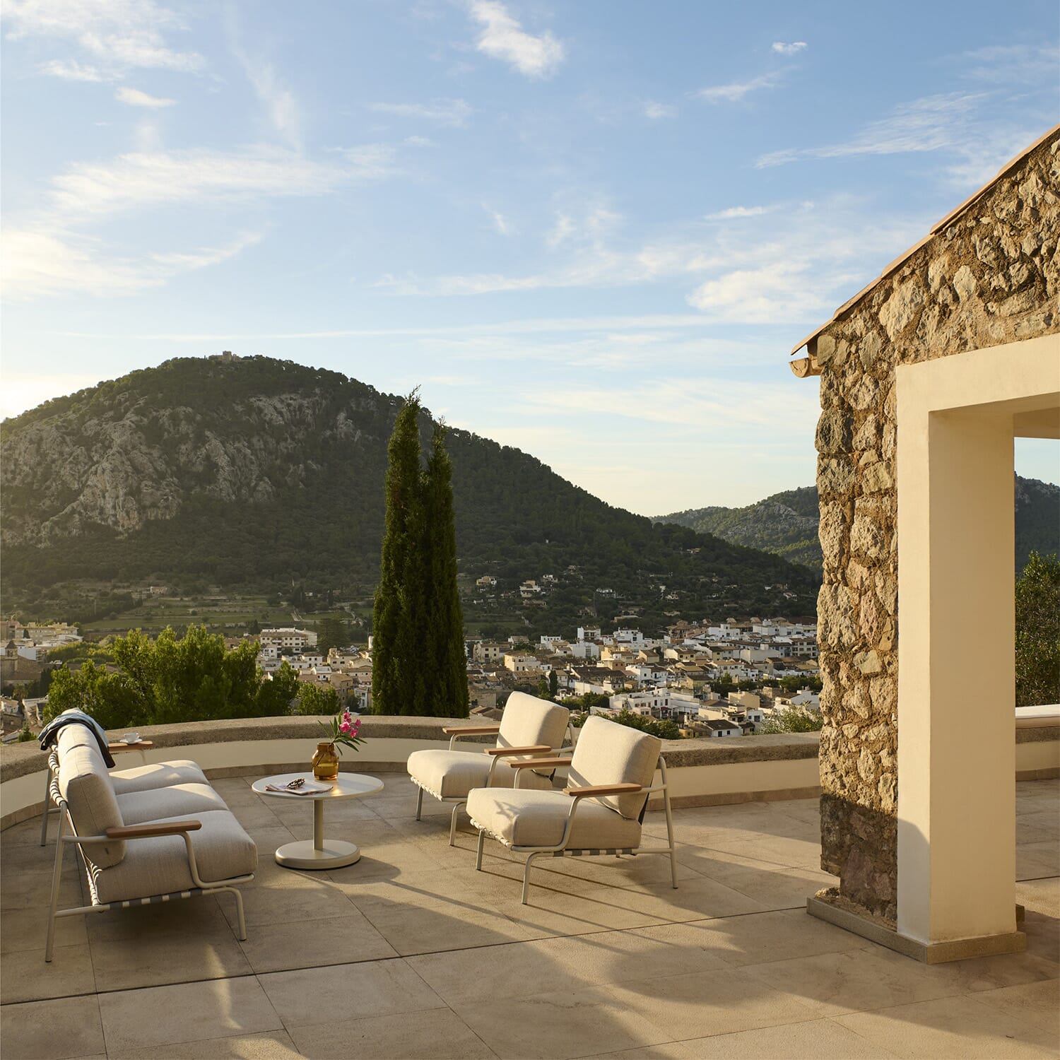 Settle Lounge Chair er en romslig og innbydende lenestol designet for utendørs bruk. Den har en luftig stålramme med synlige bånd og presise detaljer som gir et moderne uttrykk. Armlenene i FSC™-sertifisert mahogni tilfører en varm og naturlig kontrast til den pulverlakkerte stålrammen. Putene er laget av hurtigtørkende skum og trukket i værbestandige tekstiler, noe som sikrer komfort og holdbarhet under ulike værforhold. ?