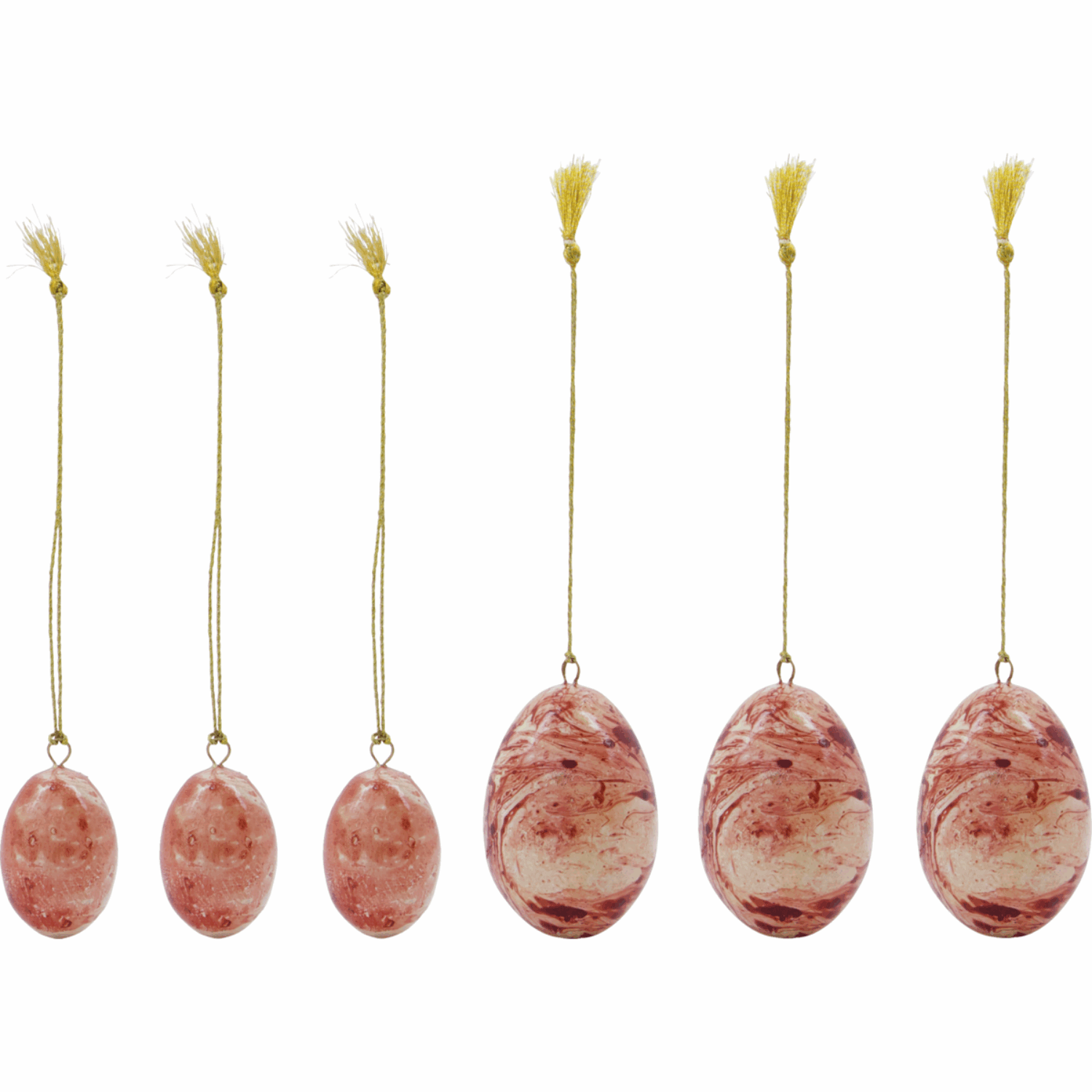 Disse håndmalte dekorasjonseggene i dyp rød farge med vakker marmor-look tilfører hjemmet ditt en følelse av estetikk, varme og personlighet. Perfekte å henge på dekorasjonsgrener eller bruke som en del av en vakker vårdekorasjon.