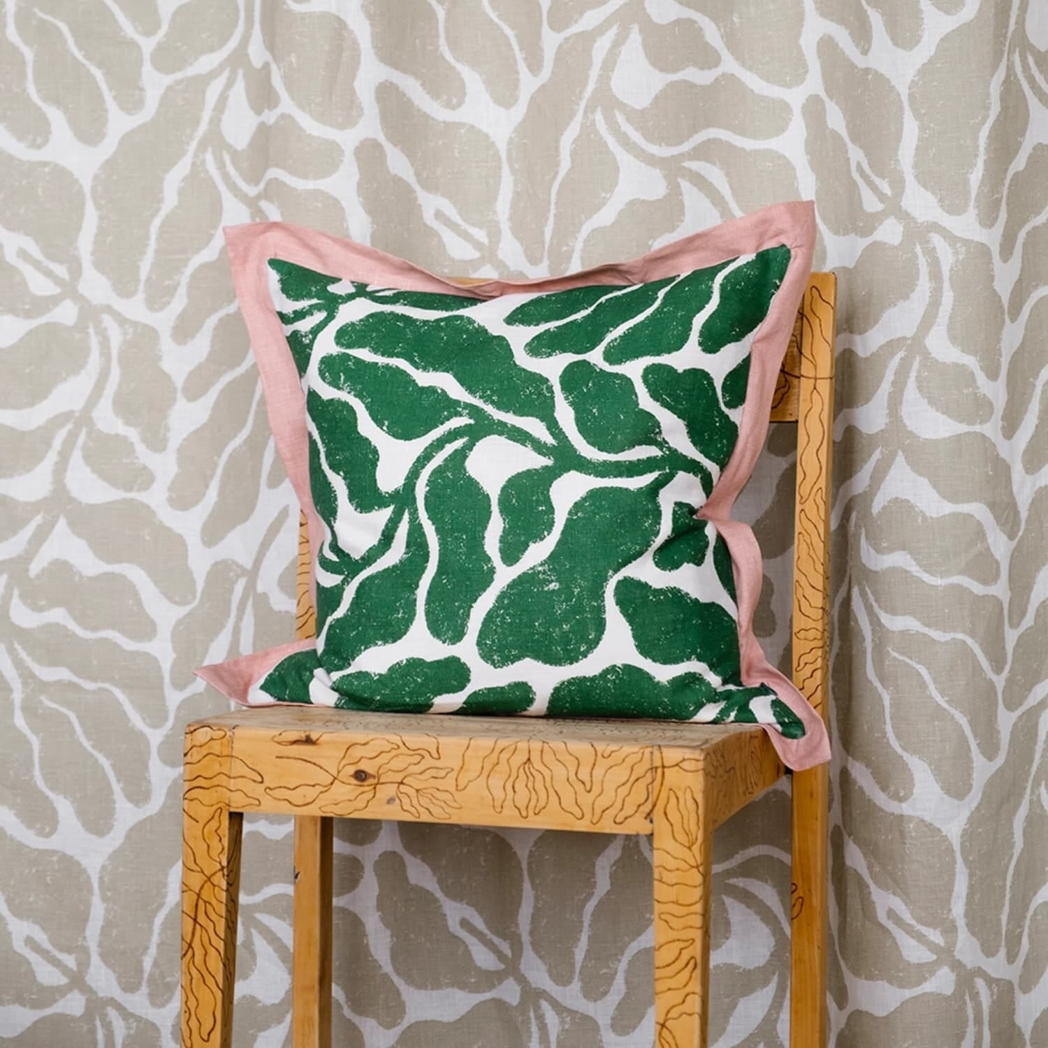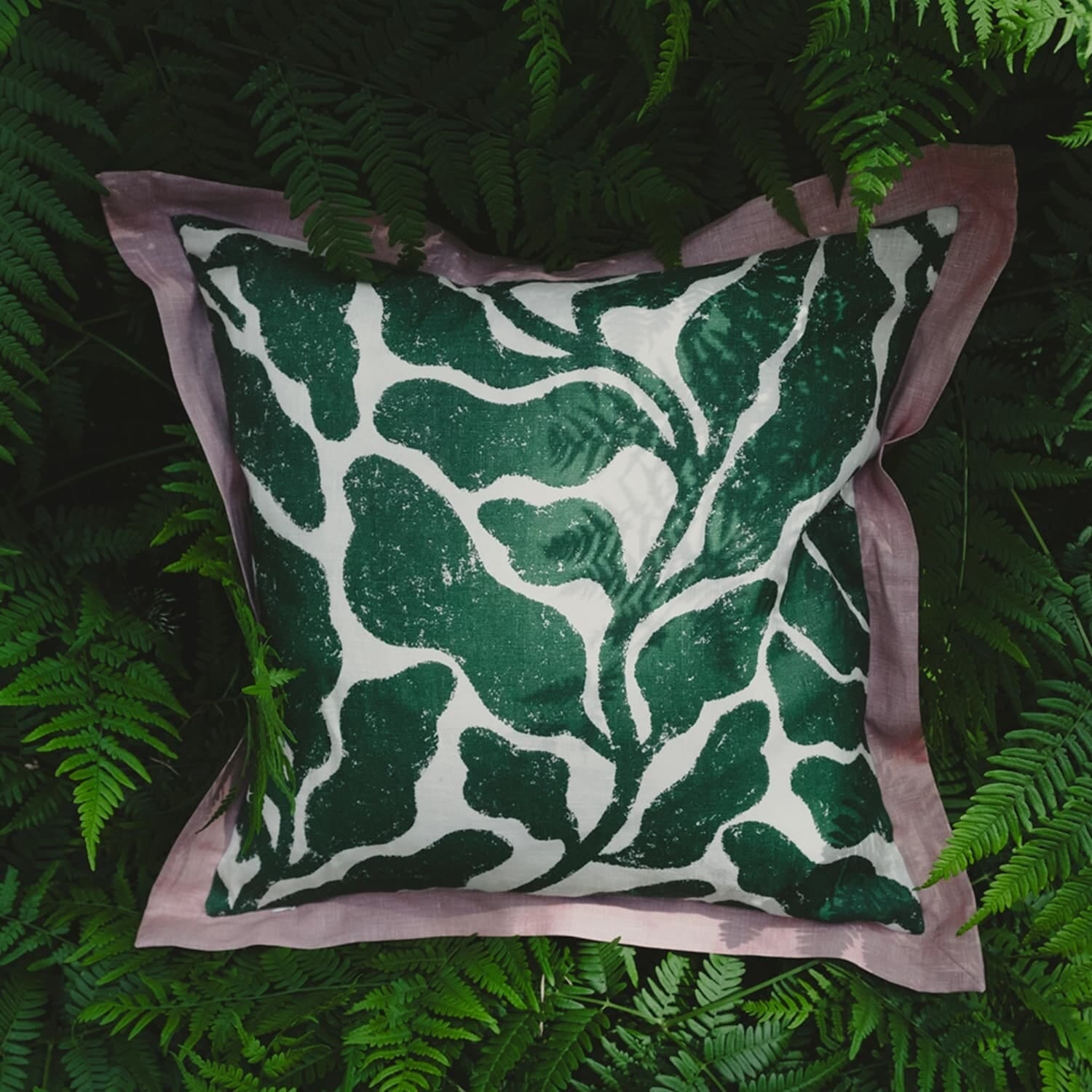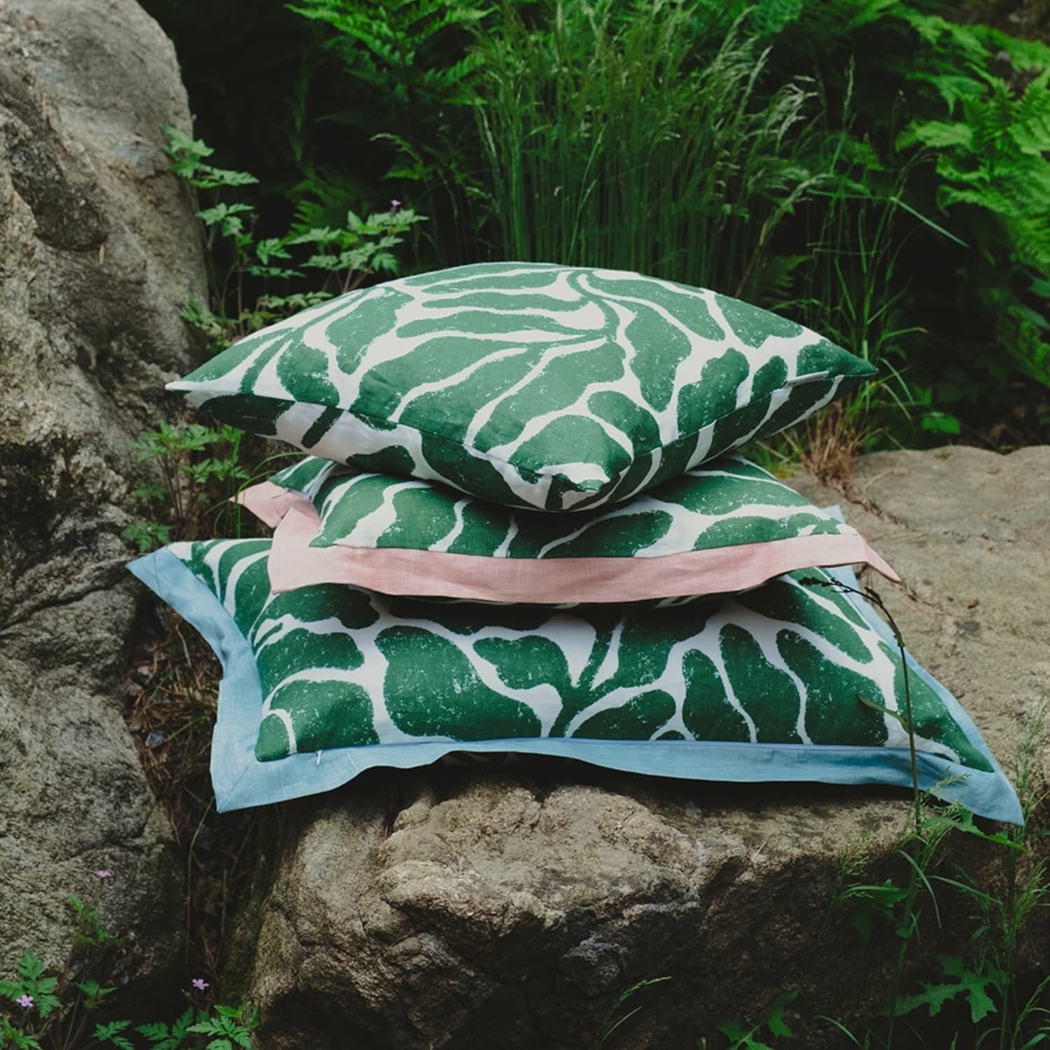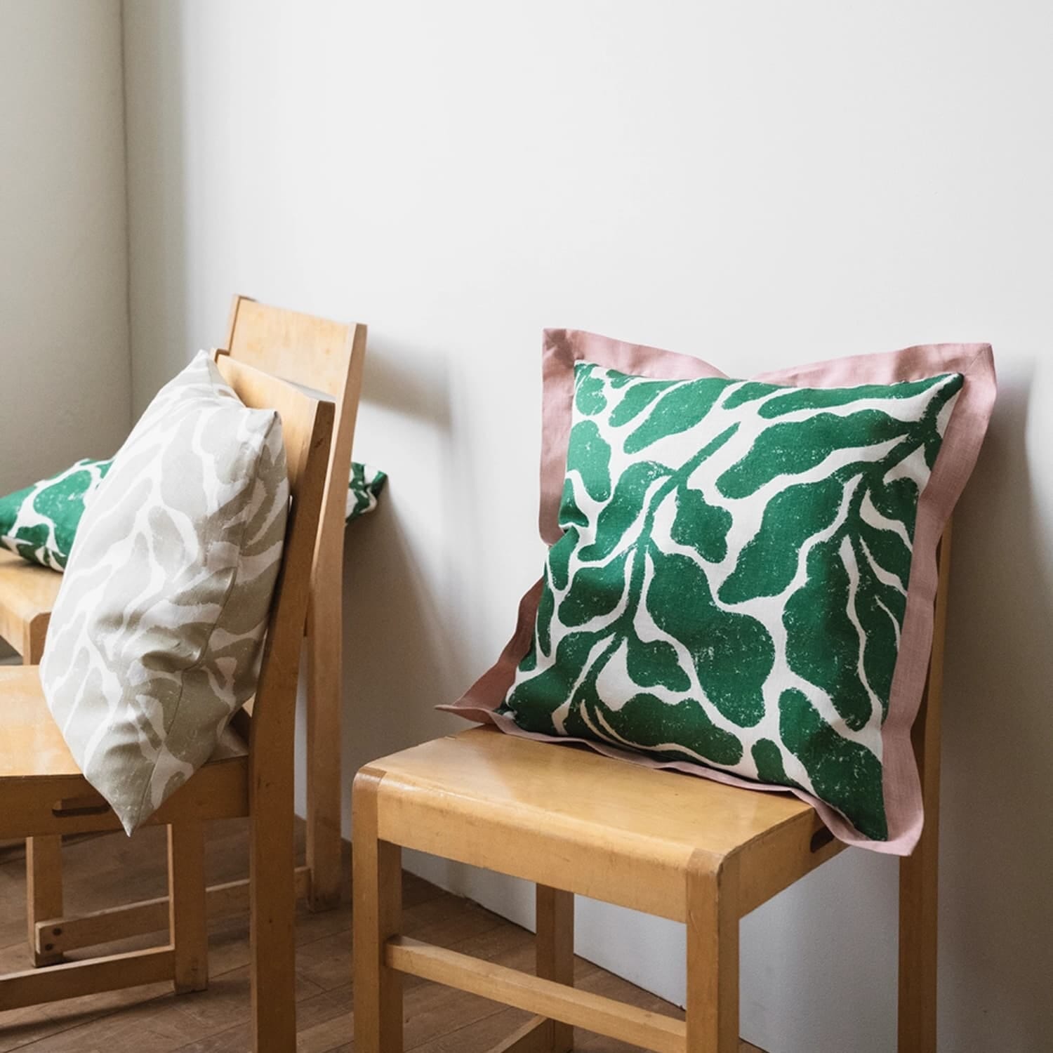 Hun er kjent for sine bølgende bladverk i klare farger, og her kommer hennes signaturmønster Leaves til uttrykk i en vakker kombinasjon av grønt og hvitt, med en rosa kontrastkant som setter prikken over i-en. Resultatet er et moderne og botanisk uttrykk som føles både minimalistisk og storslått på samme tid.