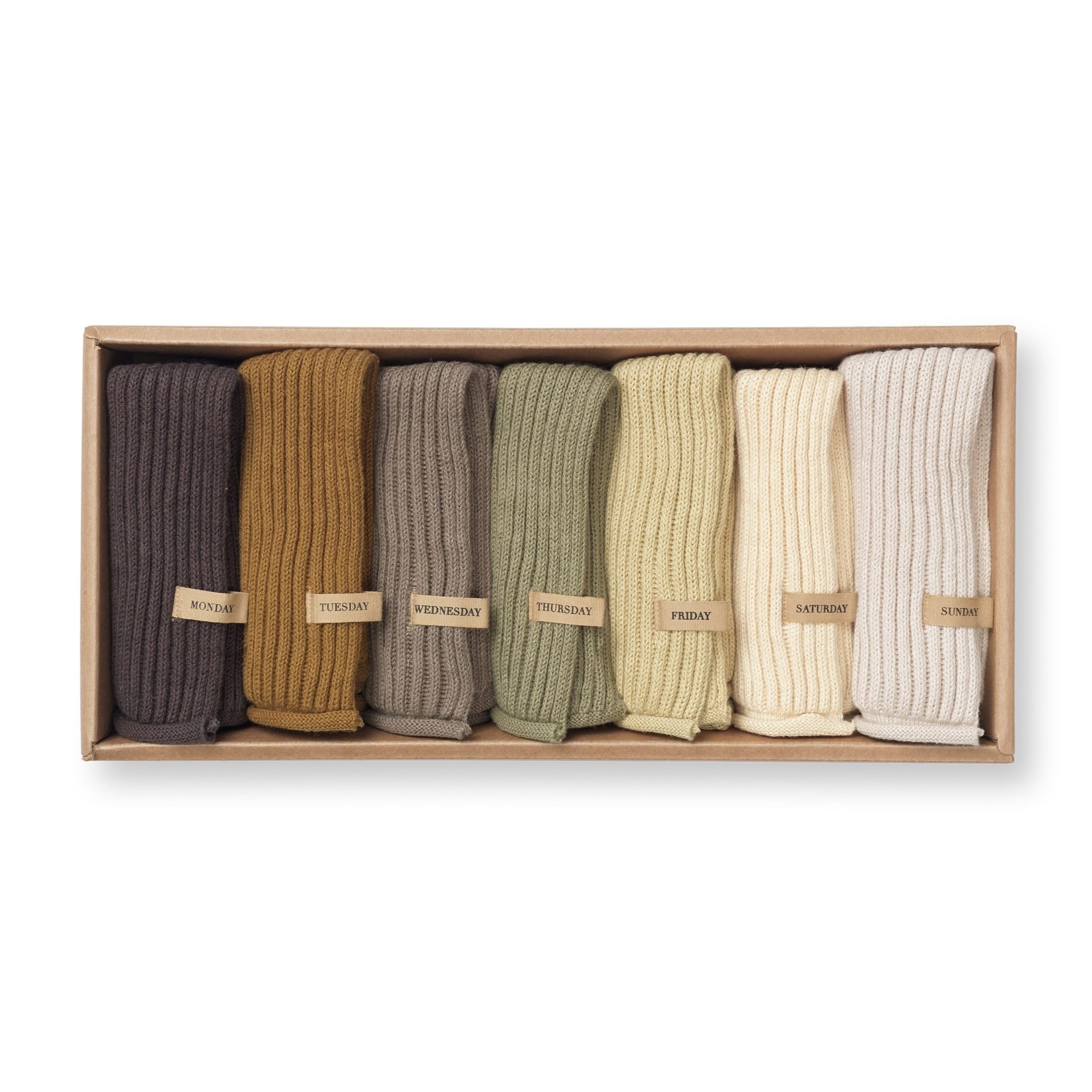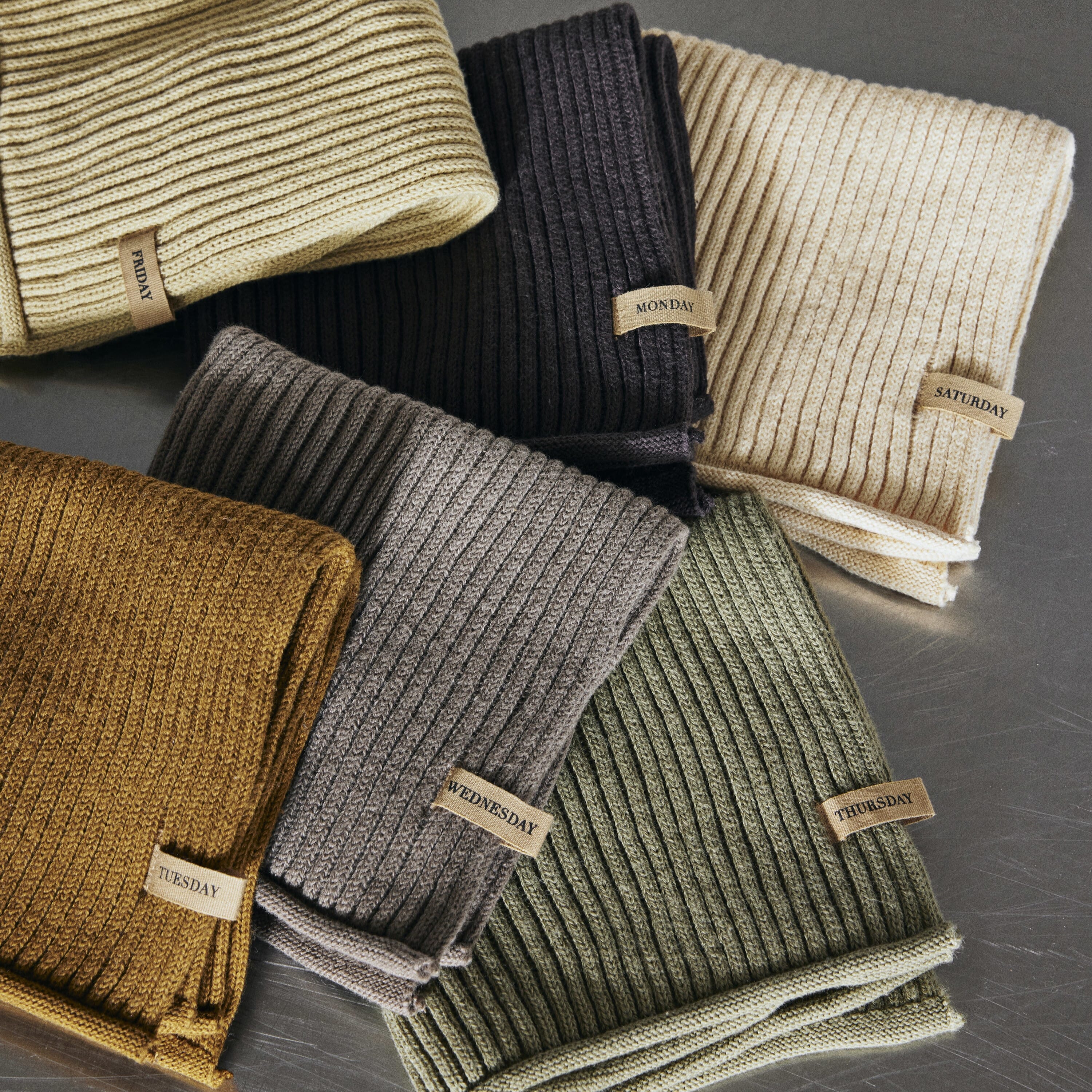 Calm oppvaskkluter er syv stilige kluter, hver med en vevd etikett som indikerer ukedagen. Laget av GOTS-sertifisert, økologisk bomull, gir de en ansvarlig og stilig tillegg til kjøkkenutstyret ditt. Disse klutene er perfekte for oppvasken og kan også brukes som flotte gaver, ettersom de kommer i en elegant eske.