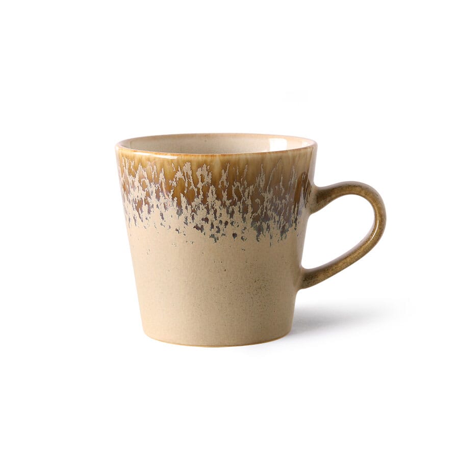 Kopp fra HK Living's populære keramikkserie som er inspirert fra 70-tallet. Krusene er alle unike på grunn av den håndlagde finishen. De varme nyansene og de rå strukturene gir koppen en leken touch.