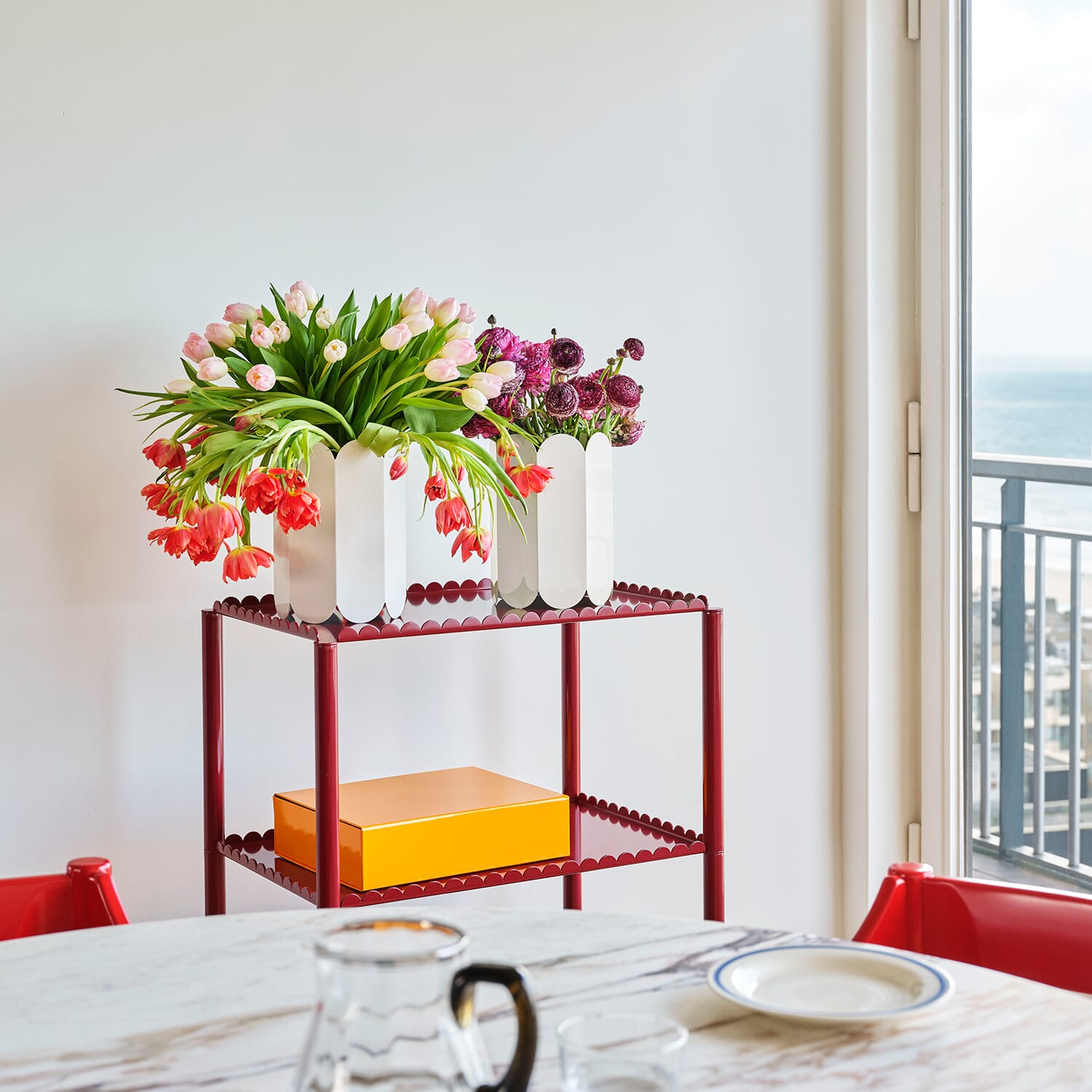 Muller Van Severen ble grunnlagt i 2011 av det belgiske kunstnerduoen Fien Muller og Hannes Van Severen. Kjent for å skape visuelt slående møbler som balanserer mellom design og kunst, henter de inspirasjon fra arkitektur og ulike materialer. Duoen har mottatt flere priser og samarbeidet med prestisjetunge museer som Vitra Museum, Centre Pompidou og Musée des Arts Décoratifs Paris. De har også stilt ut hos internasjonale gallerier som Galerie Kreo, Side Gallery og Valerie Traan Gallery. For HAY har Muller Van Severen designet flere ikoniske produkter, inkludert Two-Colour, Ceramic Table, Colour Cabinet, MVS Cutlery og Arcs-kolleksjonen.
