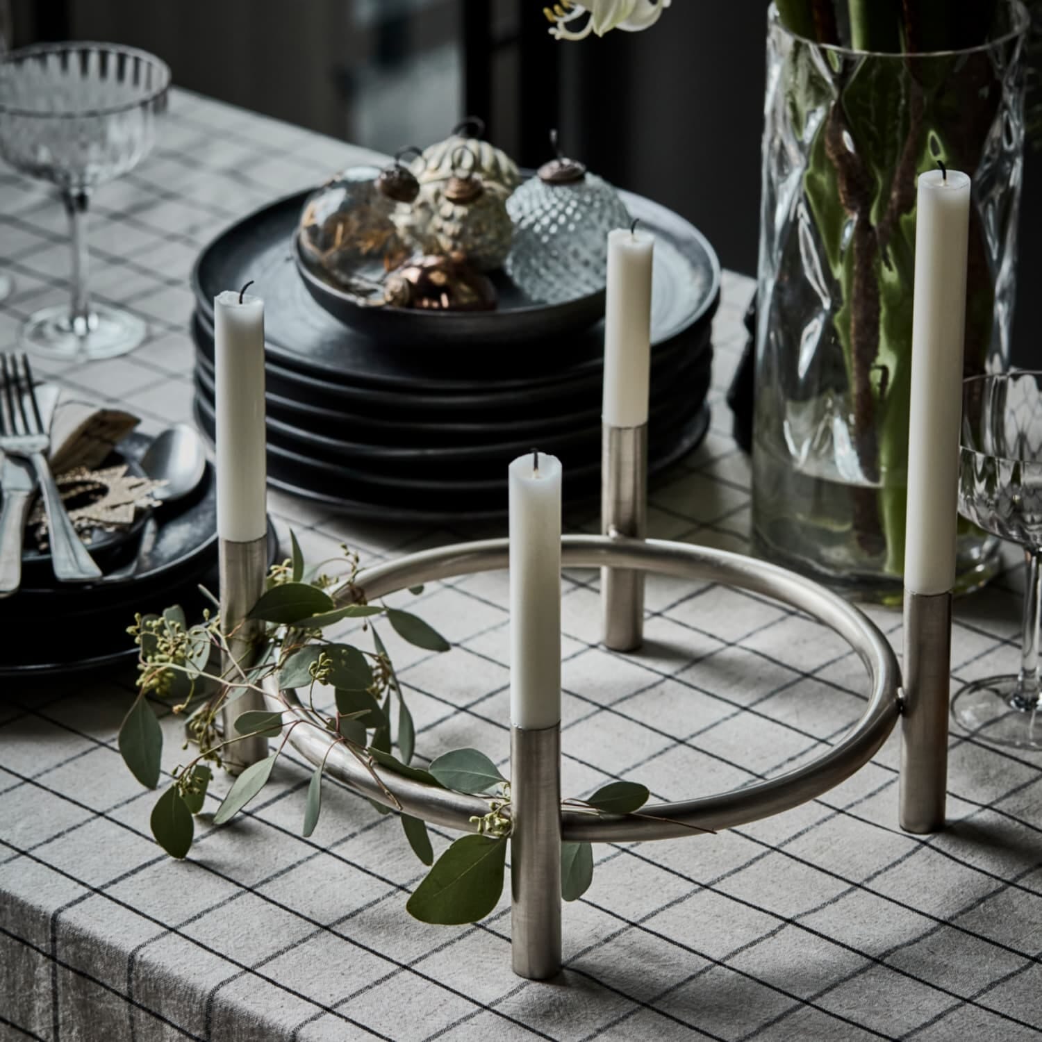 Lysestaken er håndlaget i solid jern, noe som gir den både robust kvalitet og et unikt uttrykk. Små variasjoner i finish, farge og størrelse gjør hvert eksemplar særegent. Den er stor nok til å skape et markant blikkfang på spisebordet, men samtidig enkel å tilpasse med granbar, kongler, bånd eller andre dekorative elementer. Resultatet blir et personlig og iøynefallende midtpunkt som kan brukes år etter år.
