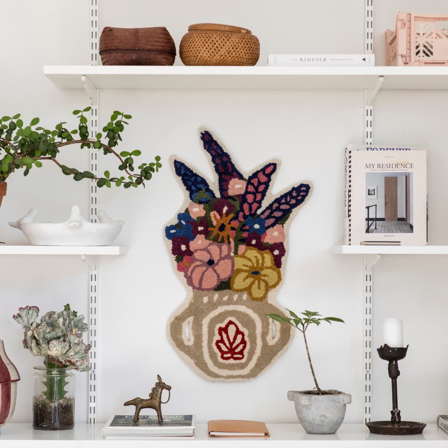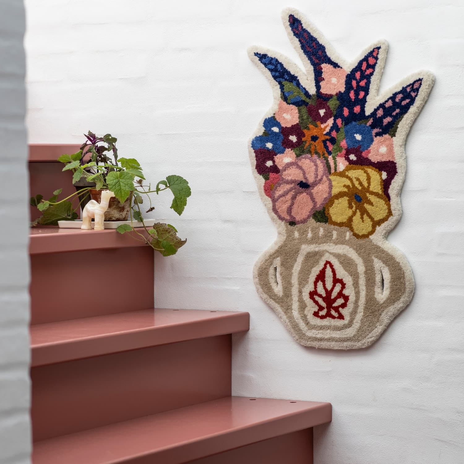 Gi interiøret et lekent og kunstnerisk løft med Flower Vase-teppet – en tekstilskulptur i form av en blomstrende vase, håndtuftet i 100 % ull.