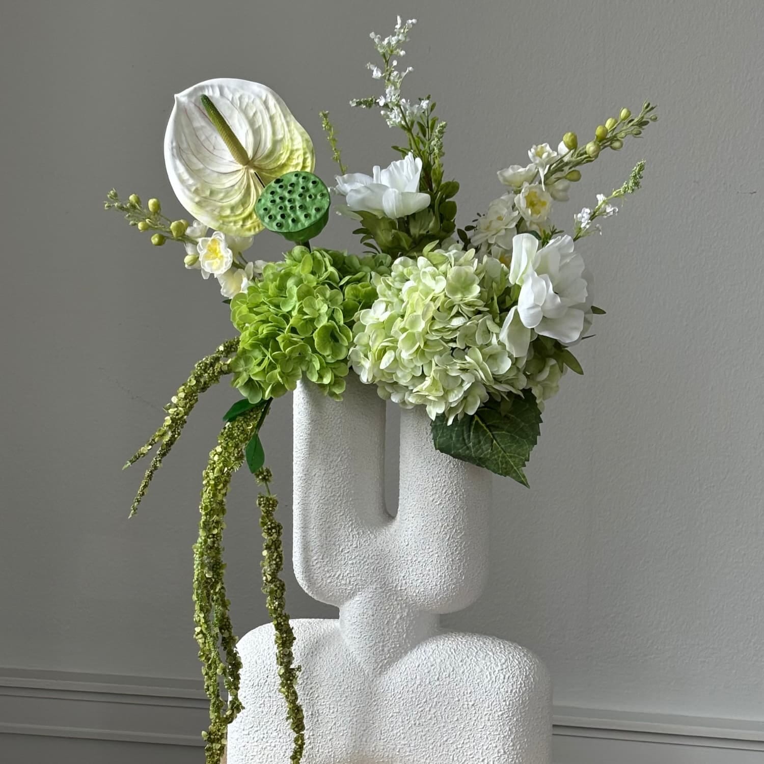 Buketten består av ni nøye sammensatte stilker: fyldige hortensiaer gir volum, mens anemoner og foxtail liljer tilfører høyde og struktur. En skulpturell anthurium og et lotusfrøhode tilfører subtil karakter og kontrast, og den hengende amaranthusen gir arrangementet en myk, organisk bevegelse som skaper et levende uttrykk – uten vedlikehold.