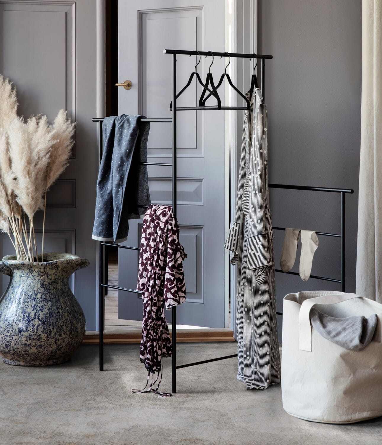 Med sine tre vegger av elegant, pulverlakkert metall, skaper Dora klesstativet en enkel oppbevaringsløsning med et snev av japansk estetikk.