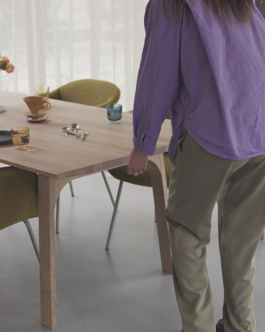 Platene er laget av FSC™-sertifisert massiv eik og behandlet med enten klar olje eller mørk olje, slik at de matcher bordets finish. Når de monteres, bevares bordets rene linjer og balanserte proporsjoner. En bevisst designdetalj er at treets ådring i ileggsplatene går i en annen retning enn bordplaten, noe som gir et subtilt, men karakterfullt visuelt spill når bordet er utvidet.