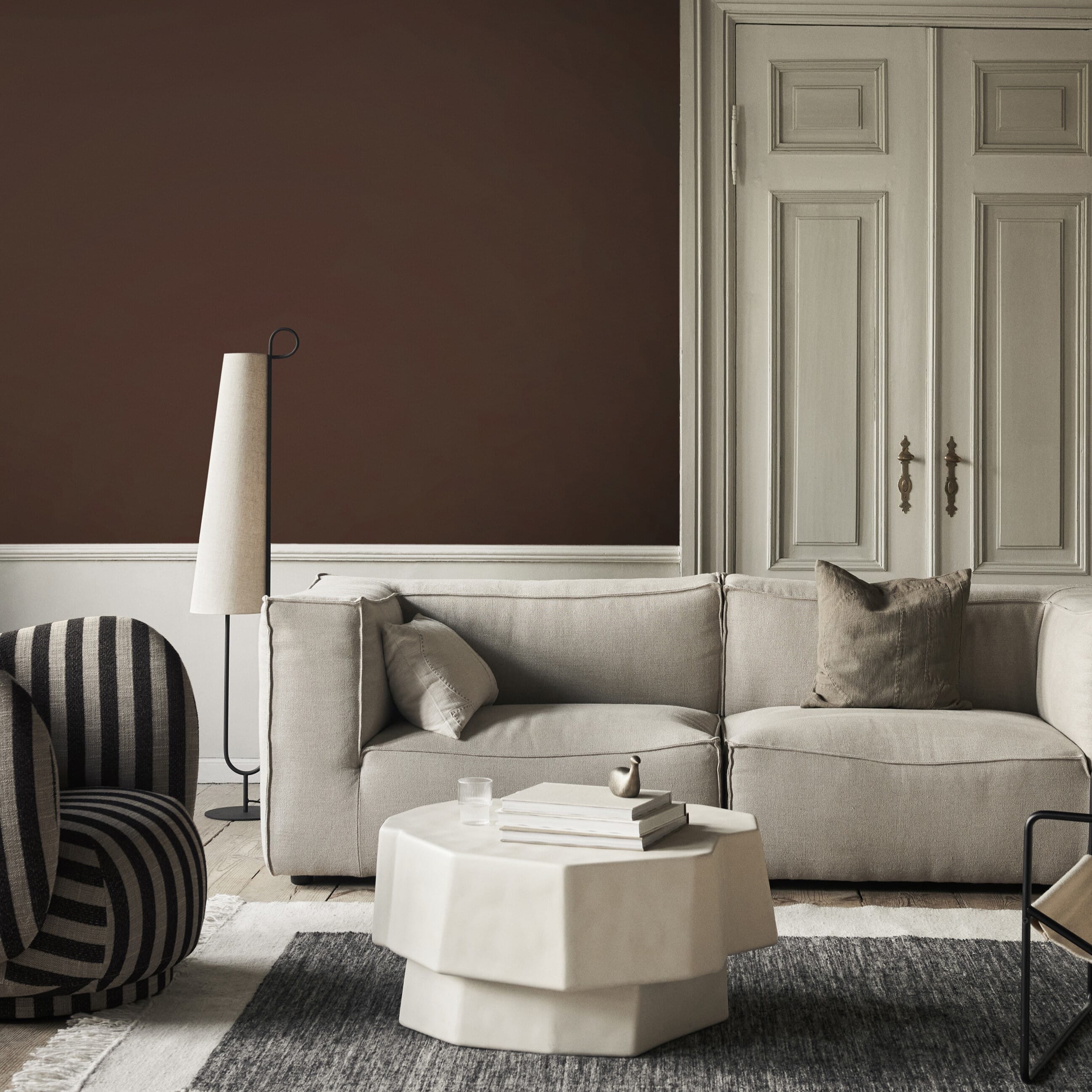 Gulvlampen Ancora har fått navnet sitt fra det italienske ordet for 'anker' og henter inspirasjon fra den karakteristiske formen. Den varme og teksturerte lampeskjermen står vakkert i kontrast til basen av pulverlakkert jern, og dette skaper et uttrykk som er poetisk og inspirert av vintage-stilen.Med denne dekorative lampen har du muligheten til å skape et uttrykk av harmonisk belysning, da det er en tidløs og elegant lampeform som kan brukes hvor som helst i hjemmet.