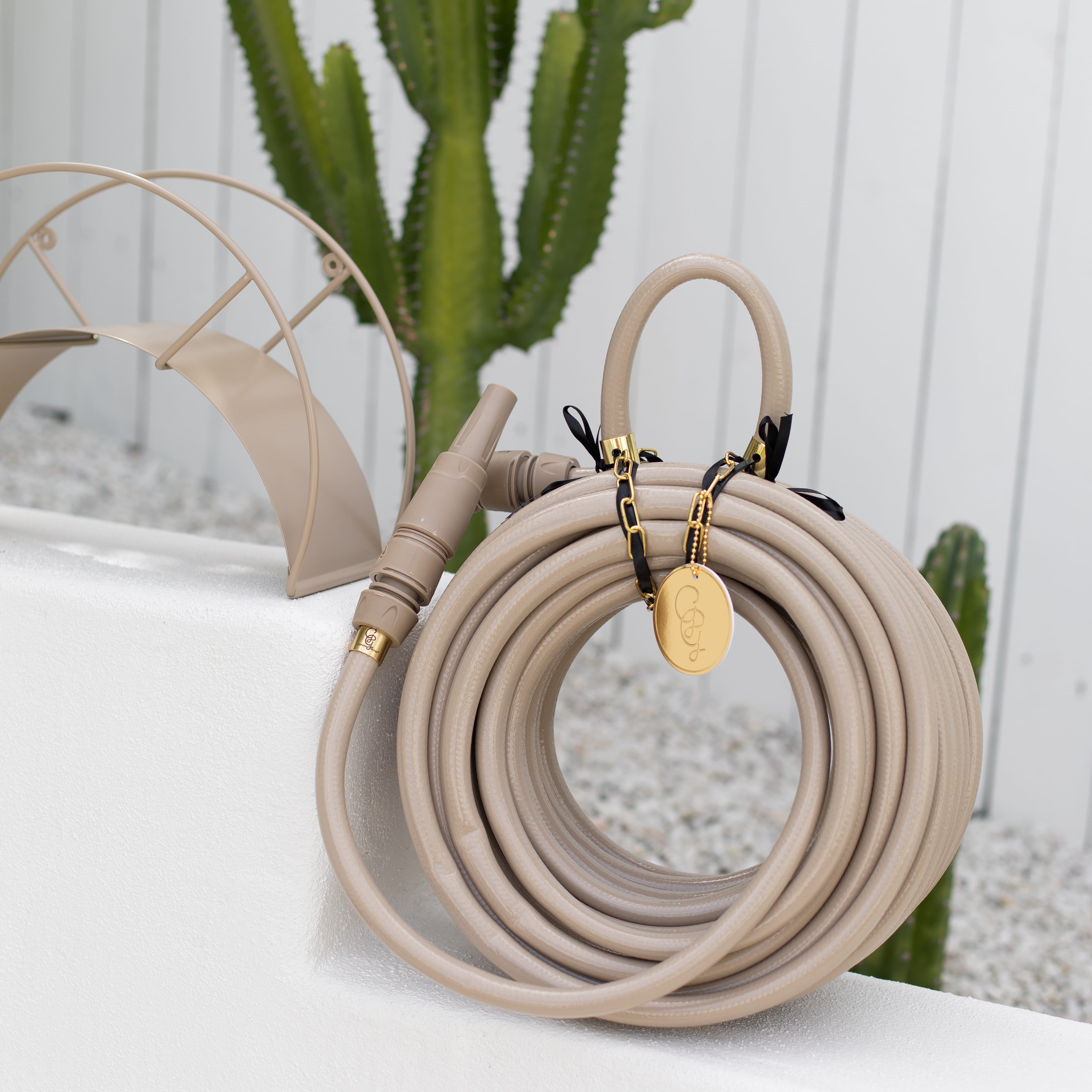 Sett med vannslange, munnstykke og veggfeste i Sahara Desert fargen.