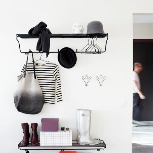 Designeren har klart å skape en funksjonell hylle med enkelhet. Hyllen finnes også i en mindre utgave. i samme serie kommer det også skohylle. Produsert i Sverige.