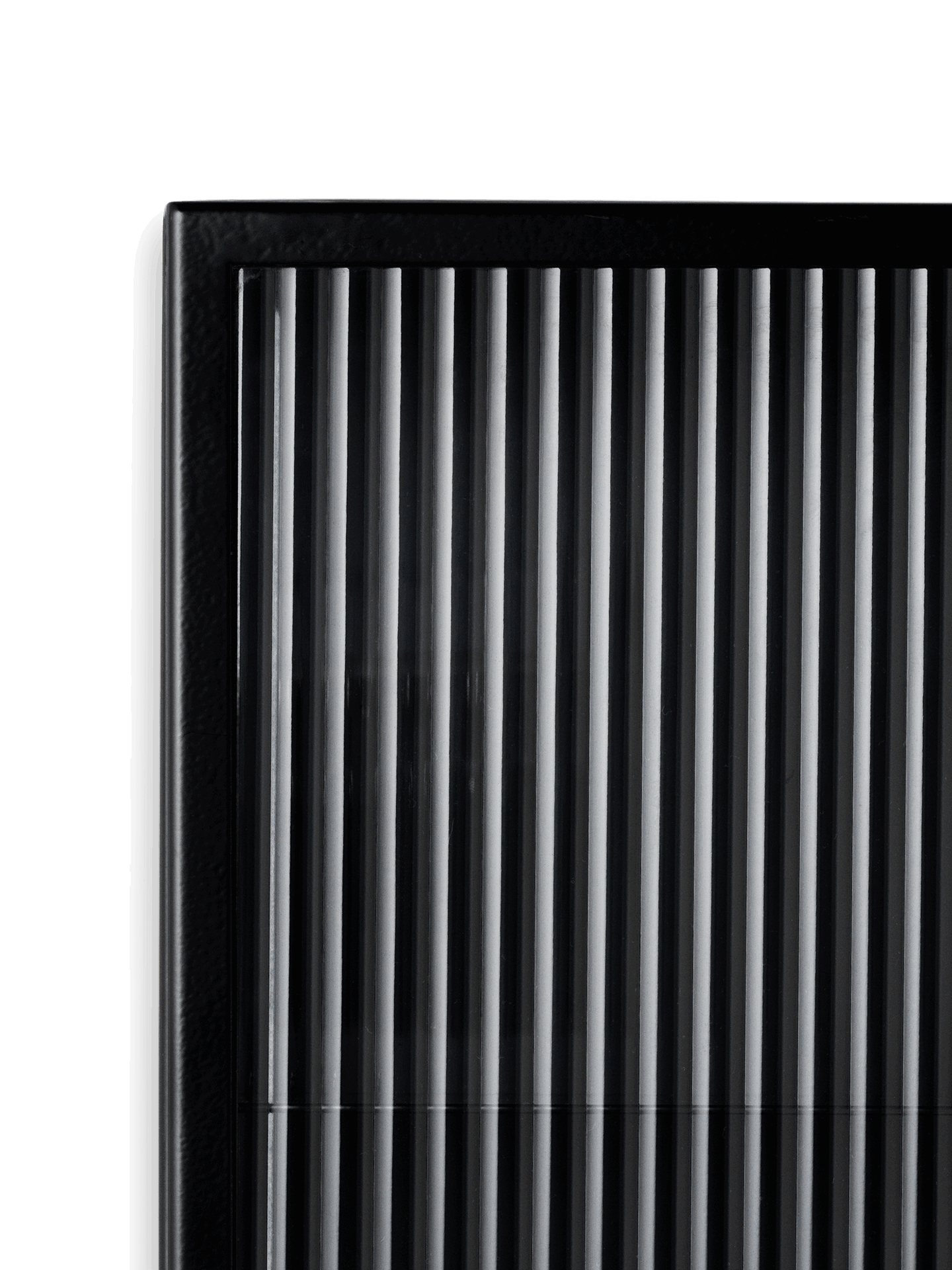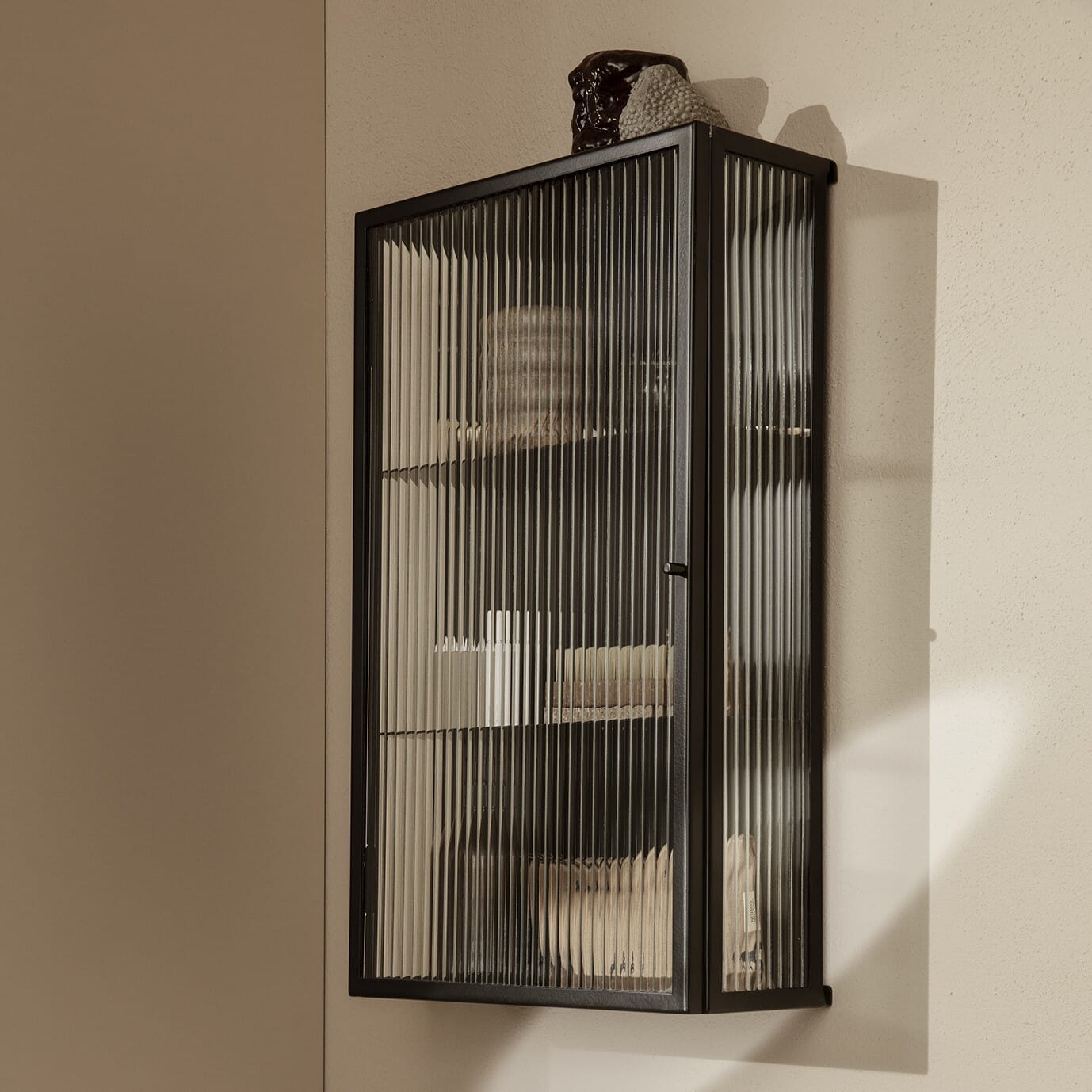 Haze veggskap - et praktisk og elegant vegghengt skap som komplementerer den industrielle estetikken. Laget med solid svart pulverlakkert stålramme, er dette skapet nå utstyrt med forseggjorte rillede glassdører.