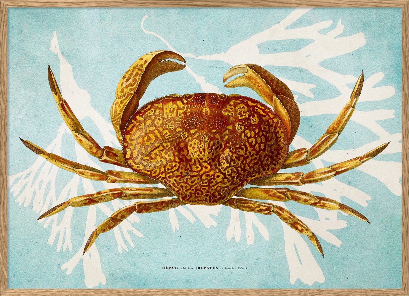 Gi hjemmet ditt et snev av havets mysterier med denne unike krabbeillustrasjonen hentet fra vitenskapelige verk fra 1800-tallet. Den detaljerte tegningen av arten Hepatus chilensis fremheves mot en bakgrunn av korall-inspirert mønster og havblå toner – en kombinasjon som gjør plakaten både iøynefallende og harmonisk.