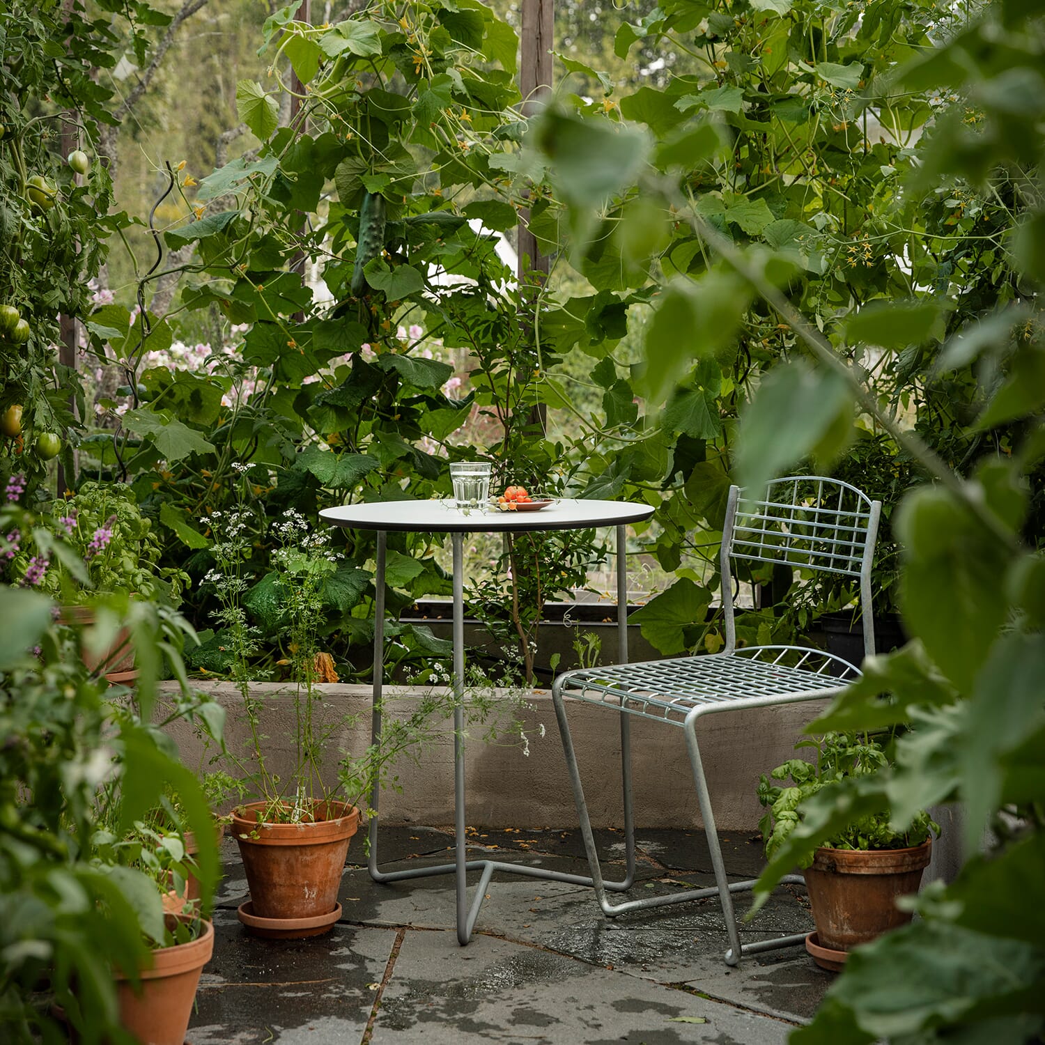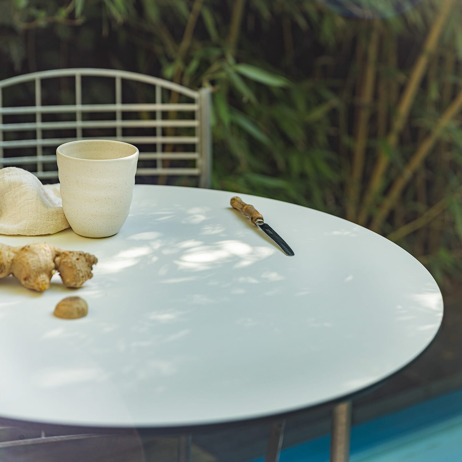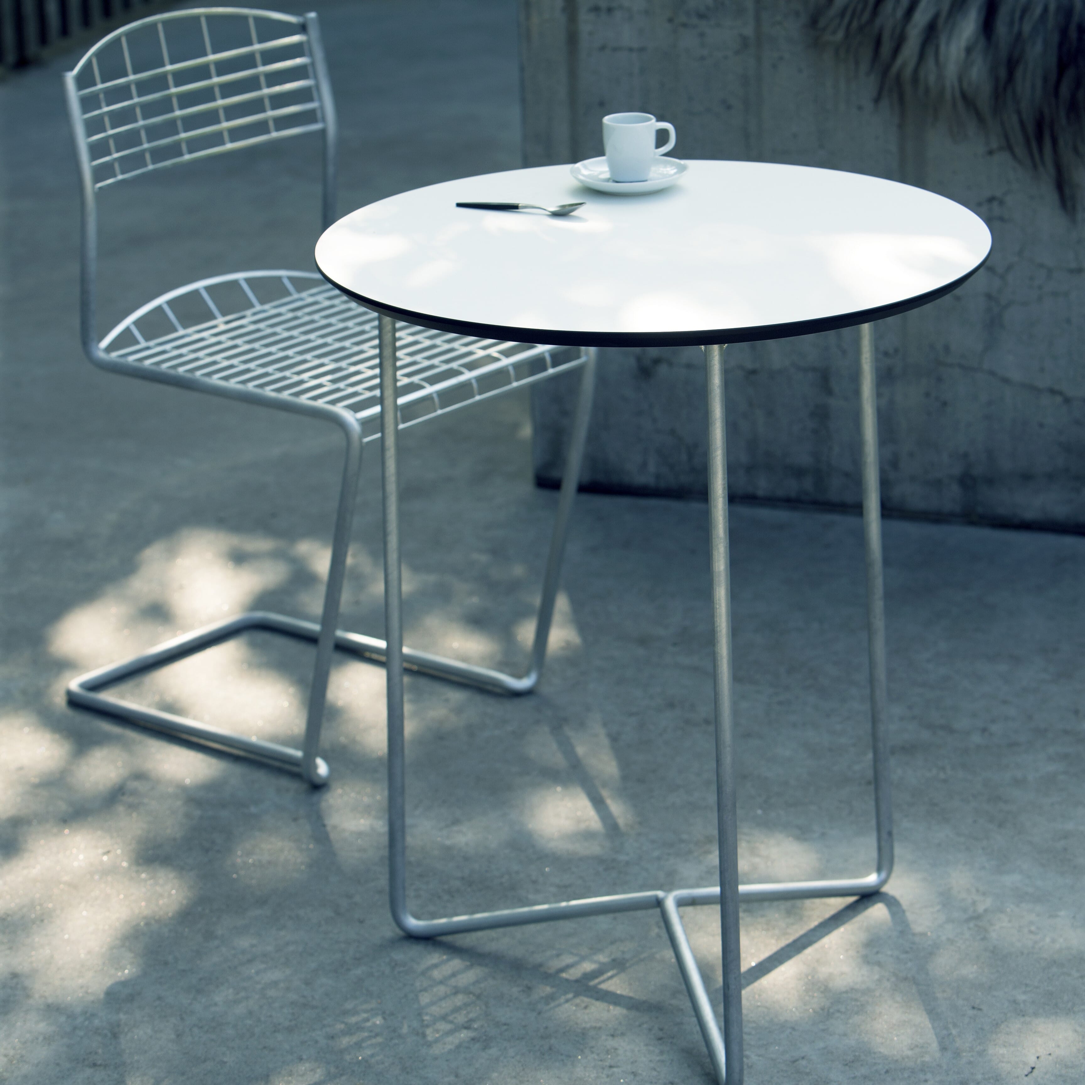Fint lite rundt bord fra High Tech-serien til Grythyttan. Bordet er konstruert med en solid stålramme og en plate laget av slitesterkt kompaktlaminat, noe som gjør det ideelt for utendørsbruk og i stand til å motstå alle slags værforhold.