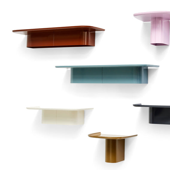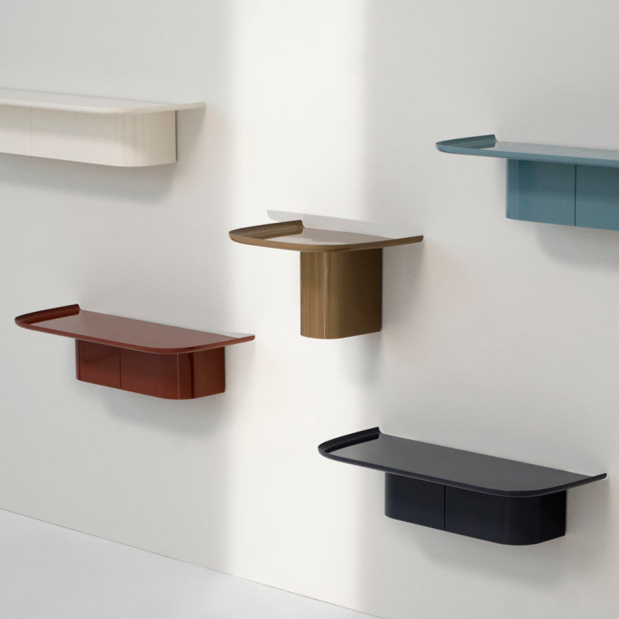Han ønsket å lage en slitesterk, multifunksjonell hylle av et resirkulerbart materiale. Korpus hyllen er laget av aluminiumsplater som er presset og bøyd til riktig fasong. De allsidige hyllene kan brukes til å organisere alt fra klær og pyntegjenstander til kjøkkenredskaper. Bruk den alene, eller lag en komposisjon av hyller i komplementære farger.