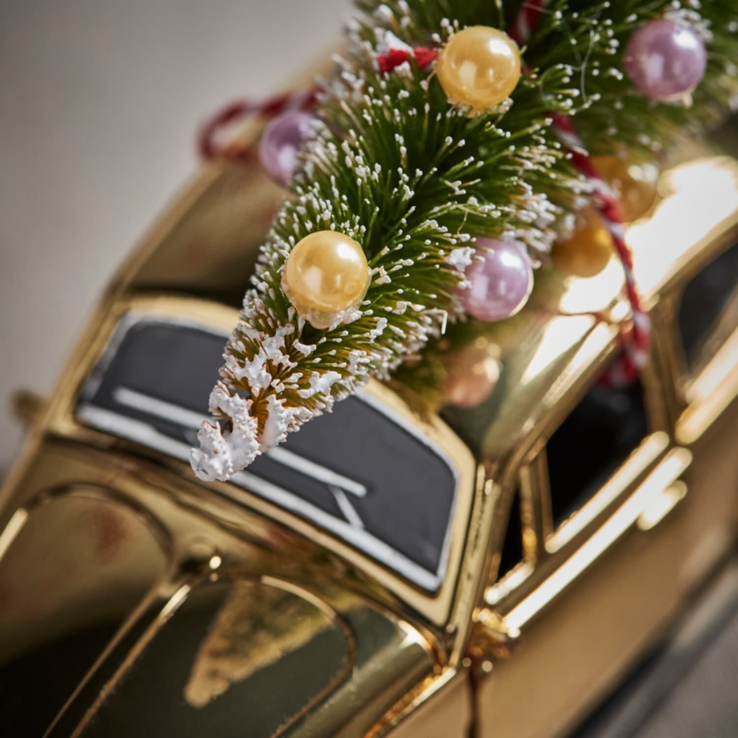 Den klassiske bilen med juletre på taket er en tidløs påminnelse om tradisjonen med å hente hjem juletreet – et symbol på samvær og høytidsglede. Den gyldne finishen gir dekorasjonen et elegant uttrykk som gjør den til et blikkfang, enten du setter den på bordet som en del av en festlig dekking, plasserer den i vinduskarmen eller lar den stå alene for et minimalistisk preg.