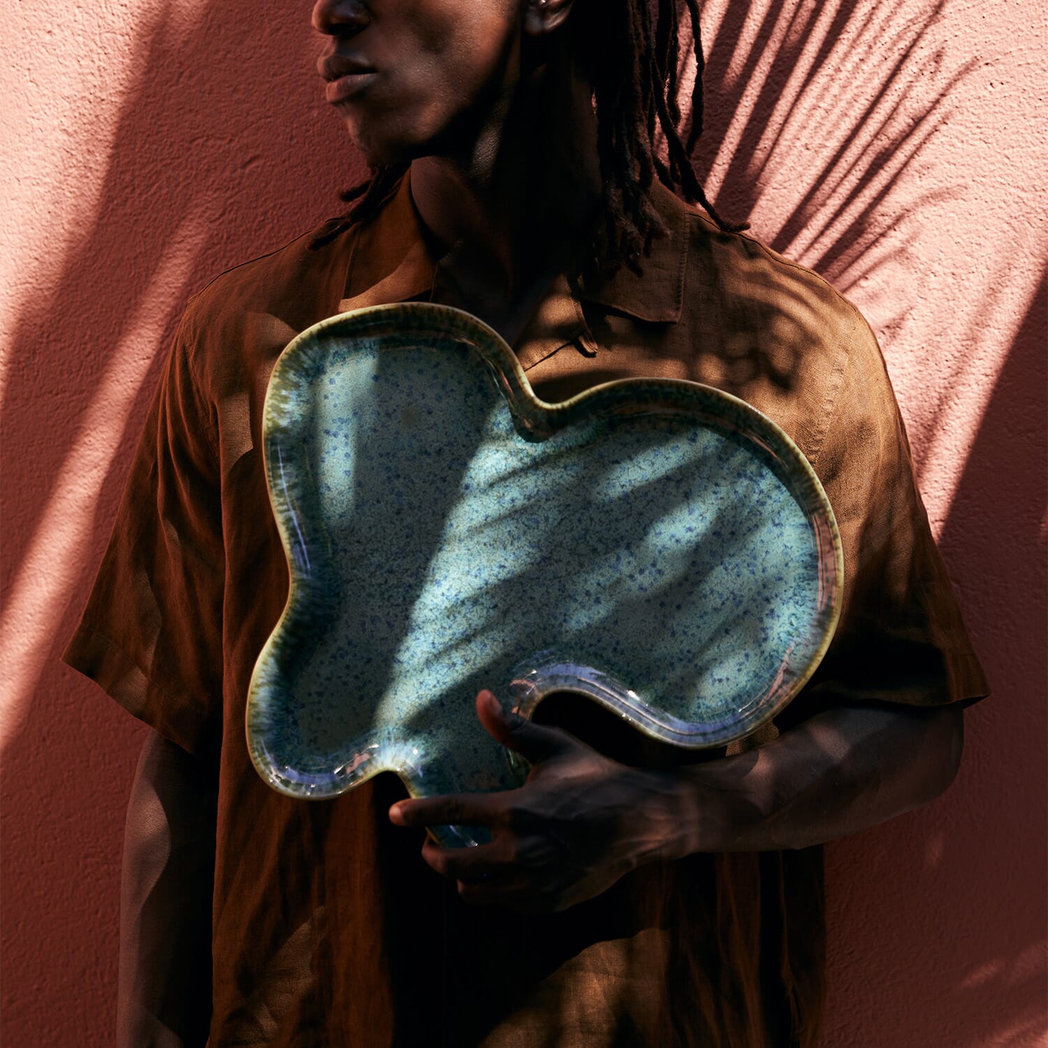 Laget av solid steintøy og dekket med en slitesterk glasur, kombinerer det både funksjonalitet og estetisk uttrykk. Den dype blågrønne fargen tilfører en følelse av ro og luksus, enten du bruker det som serveringsfat, dekor eller som et kunstnerisk midtpunkt på bordet.