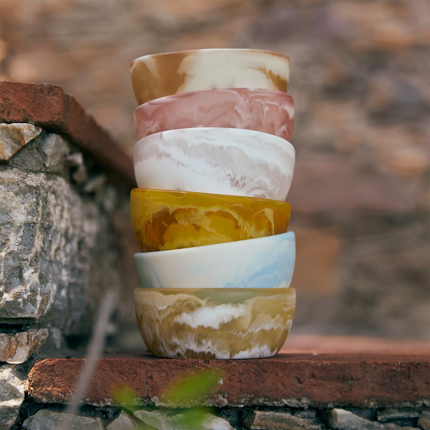 Legg til et kunstnerisk preg på borddekkingen med Patio Skål i myk gul nyanse. Hver skål er laget av slitesterk polyesterharpiks og har et unikt marmorert mønster som gjør hver enkelt helt unik. Disse skålene passer perfekt til servering av tilbehør, både inne og ute, og er et stilig og funksjonelt valg for enhver anledning