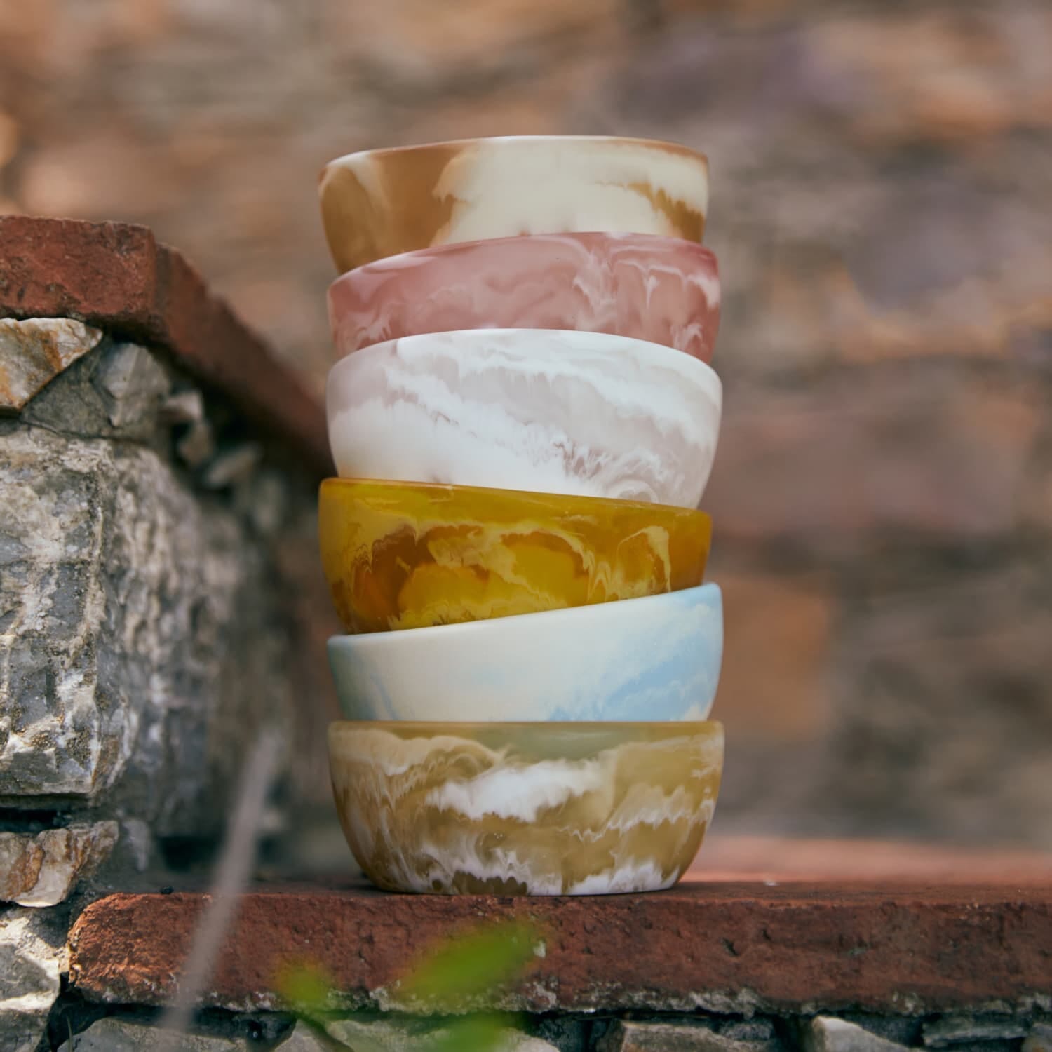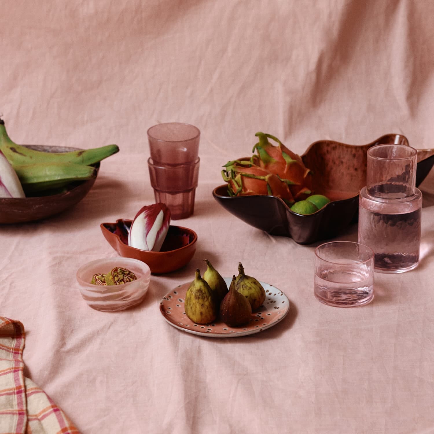 Hver skål er et lite kunstverk i seg selv, da det håndlagde utseendet varierer i mønster og nyanse. Den rosa nyansen – "Blush" – bringer en myk og moderne fargetone til bordet, og gjør seg like godt innendørs som på terrassen under lune sommerkvelder.