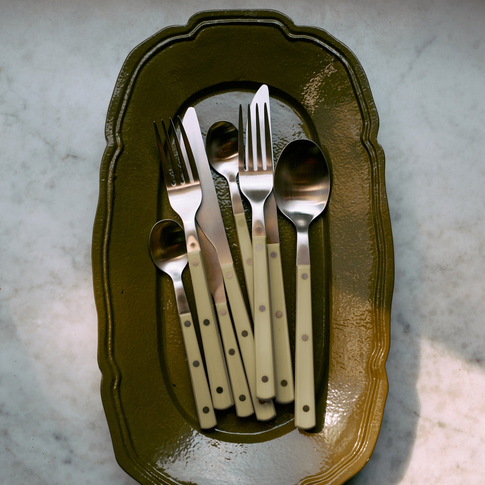 Utført i metall med en jevn, olivengrønn finish, fremstår brettet både jordnært og elegant – et design som løfter enhver servering med sitt enkle, men sofistikerte uttrykk.
