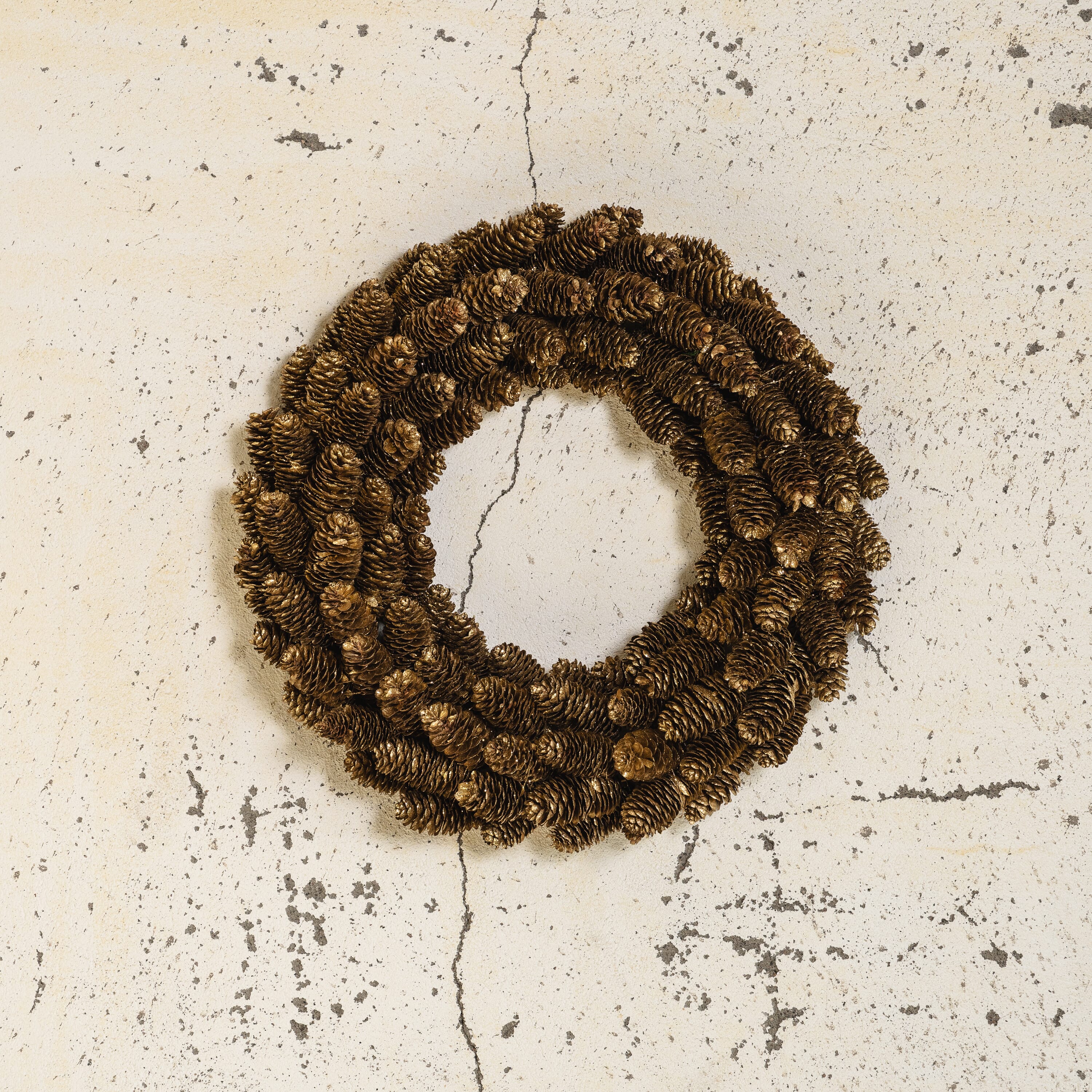 Nydelig julekrans fra Shishi som bugner av grankongler dekt med gullglitter.