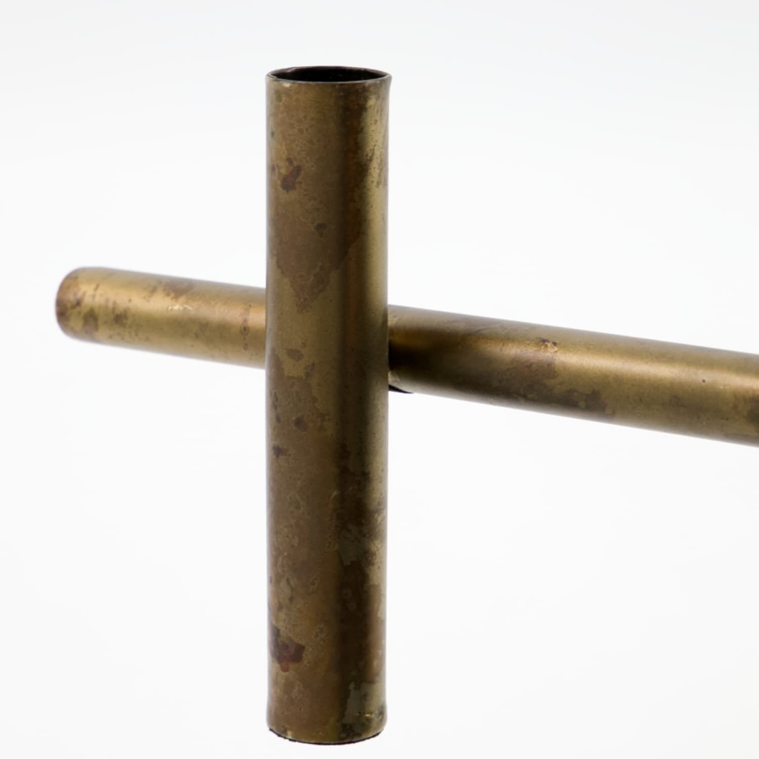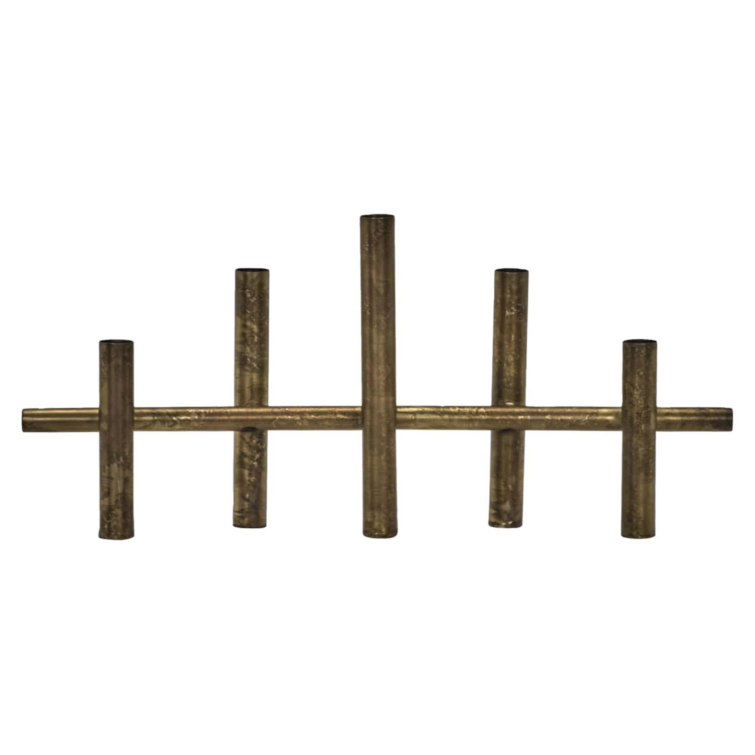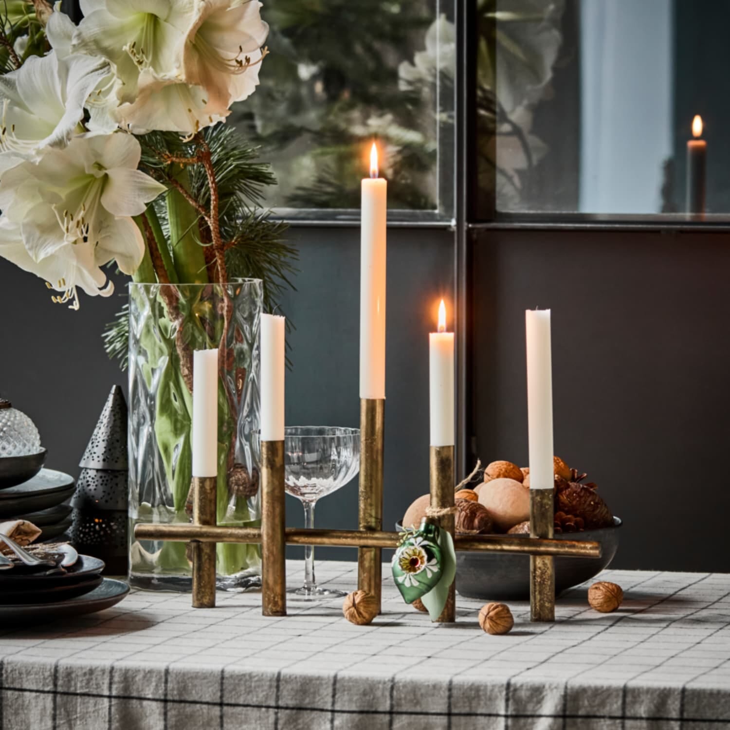Med sin antikke messingfinish fremstår den både raffinert og klassisk, samtidig som den slanke og moderne formen gjør den til et naturlig midtpunkt på spisebordet, skjenken eller peishylla. Den lange konstruksjonen gir plass til flere lys, og skaper en varm og innbydende atmosfære – perfekt for både hverdagsmiddager og festlige anledninger.