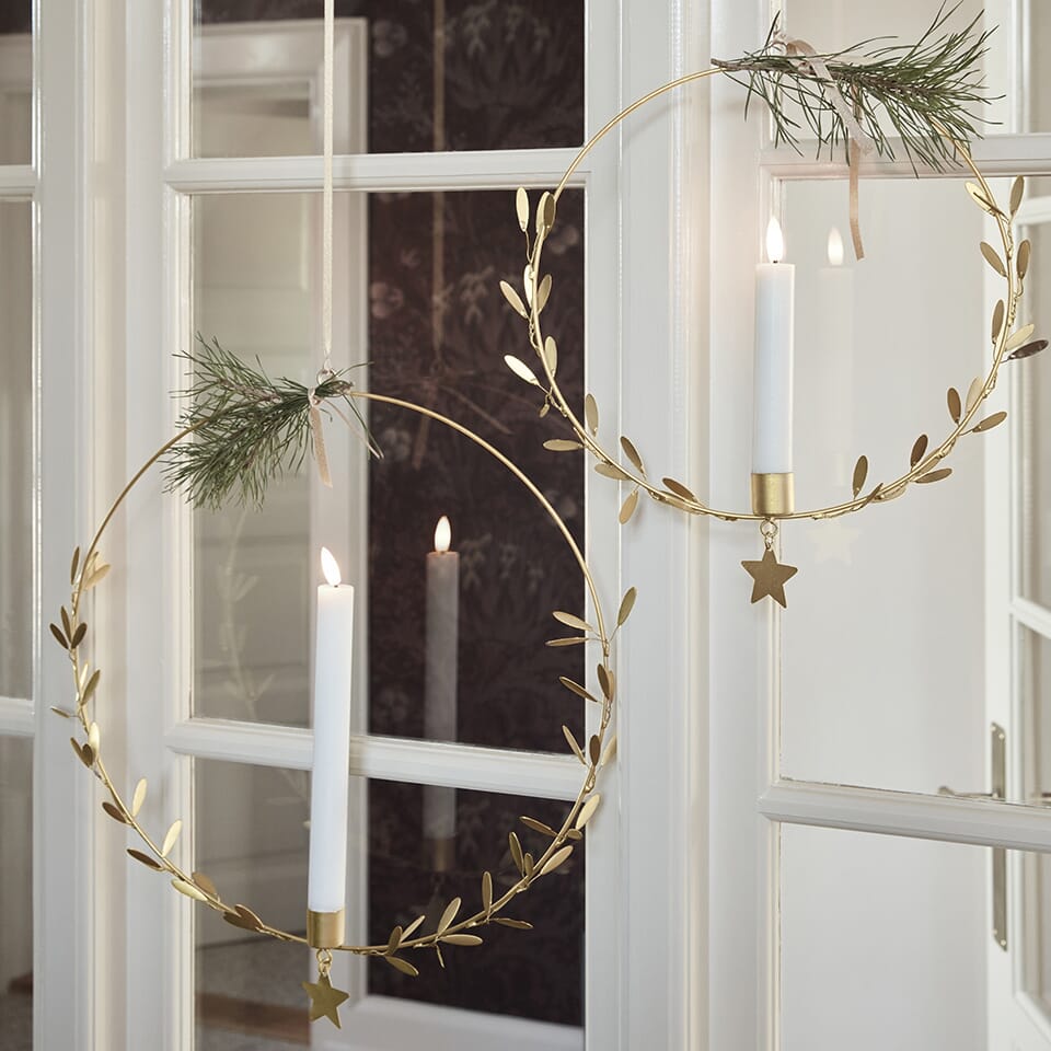 Flott hengende lysestake fra House Doctor. Med sin messingoverflate og delikate blad- og stjerneutsmykning legger den til en elegant touch til ethvert rom. Perfekt for å spre lys fra vinduet eller taket når bordplassen er begrenset. Legg til din personlige vri med en enkel sløyfe eller noen kvister.