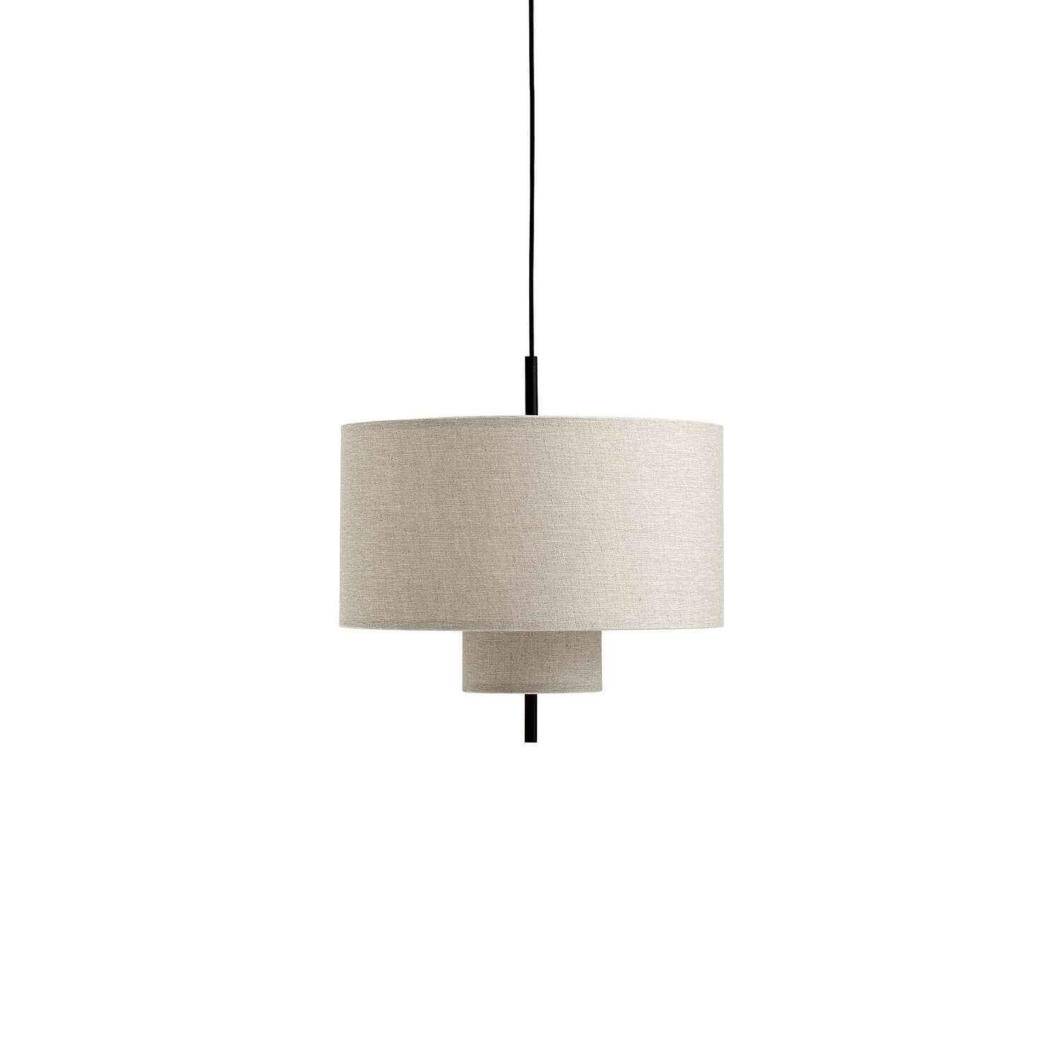 Materiale: Naturlig lin stoff kombinert med et diffuserende materiale for jevn lysfordeling, montert på en solid sort stålramme for stabilitet.