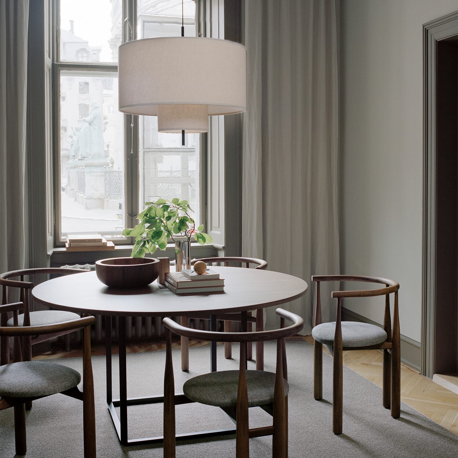 Margin-belysningsserien er designer John Asburys moderne tolkning av en klassisk lampe. Ved å utforske et lagdelt design, sprer Margins overlappende skjermer lyset på en myk måte og skaper umiddelbart en varm og innbydende atmosfære. Stoffets mykhet balanseres av en ren, grafisk silhuett som gir rommet en følelse av tilstedeværelse og volum. Det er proporsjonene, sammen med detaljer som det linjeformede elementet gjennom lampen, som skaper en skarp estetikk og fremhever Margins unike karakter.