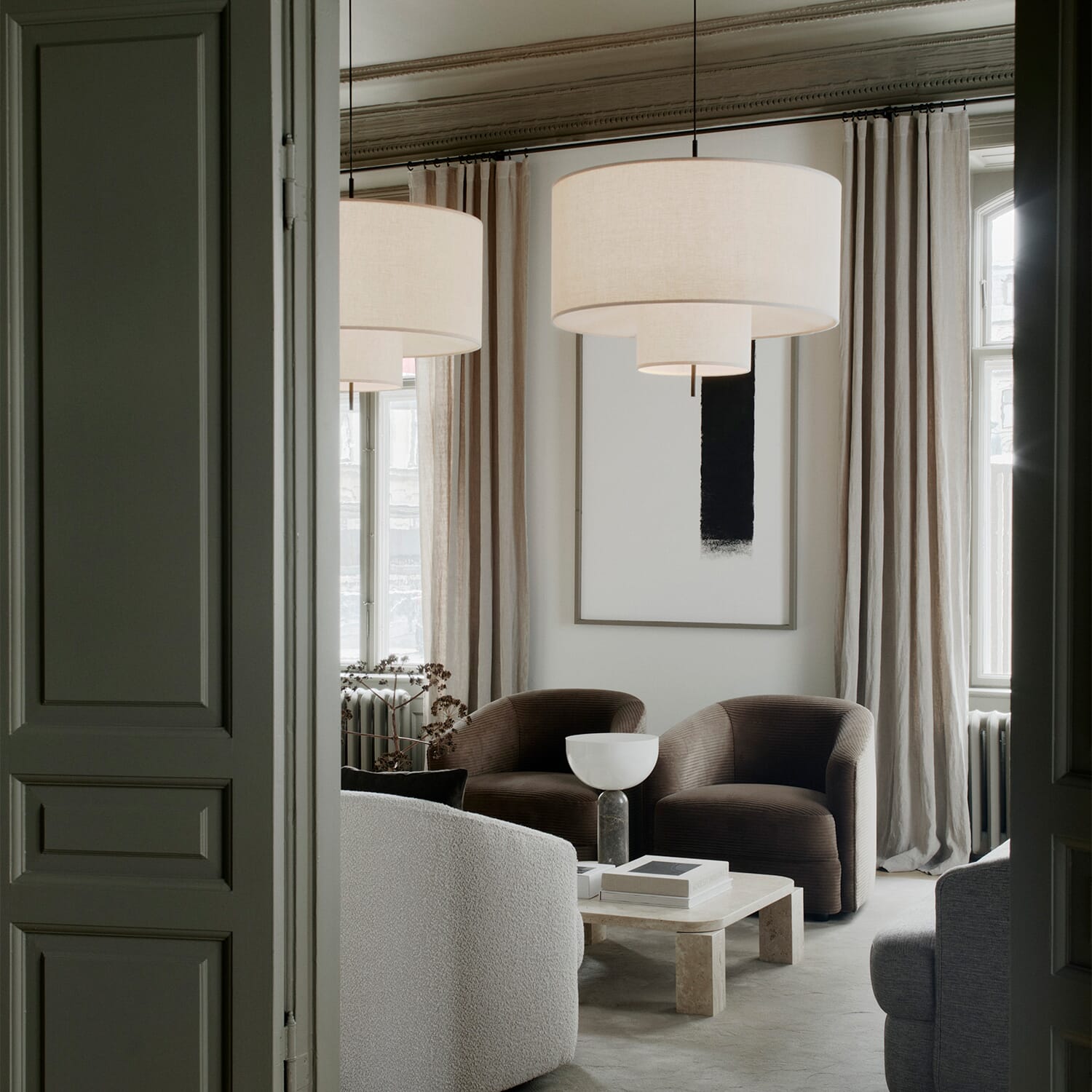 Margin-belysningsserien er designer John Asburys moderne tolkning av en klassisk lampe. Ved å utforske et lagdelt design, sprer Margins overlappende skjermer lyset på en myk måte og skaper umiddelbart en varm og innbydende atmosfære. Stoffets mykhet balanseres av en ren, grafisk silhuett som gir rommet en følelse av tilstedeværelse og volum. Det er proporsjonene, sammen med detaljer som det linjeformede elementet gjennom lampen, som skaper en skarp estetikk og fremhever Margins unike karakter.