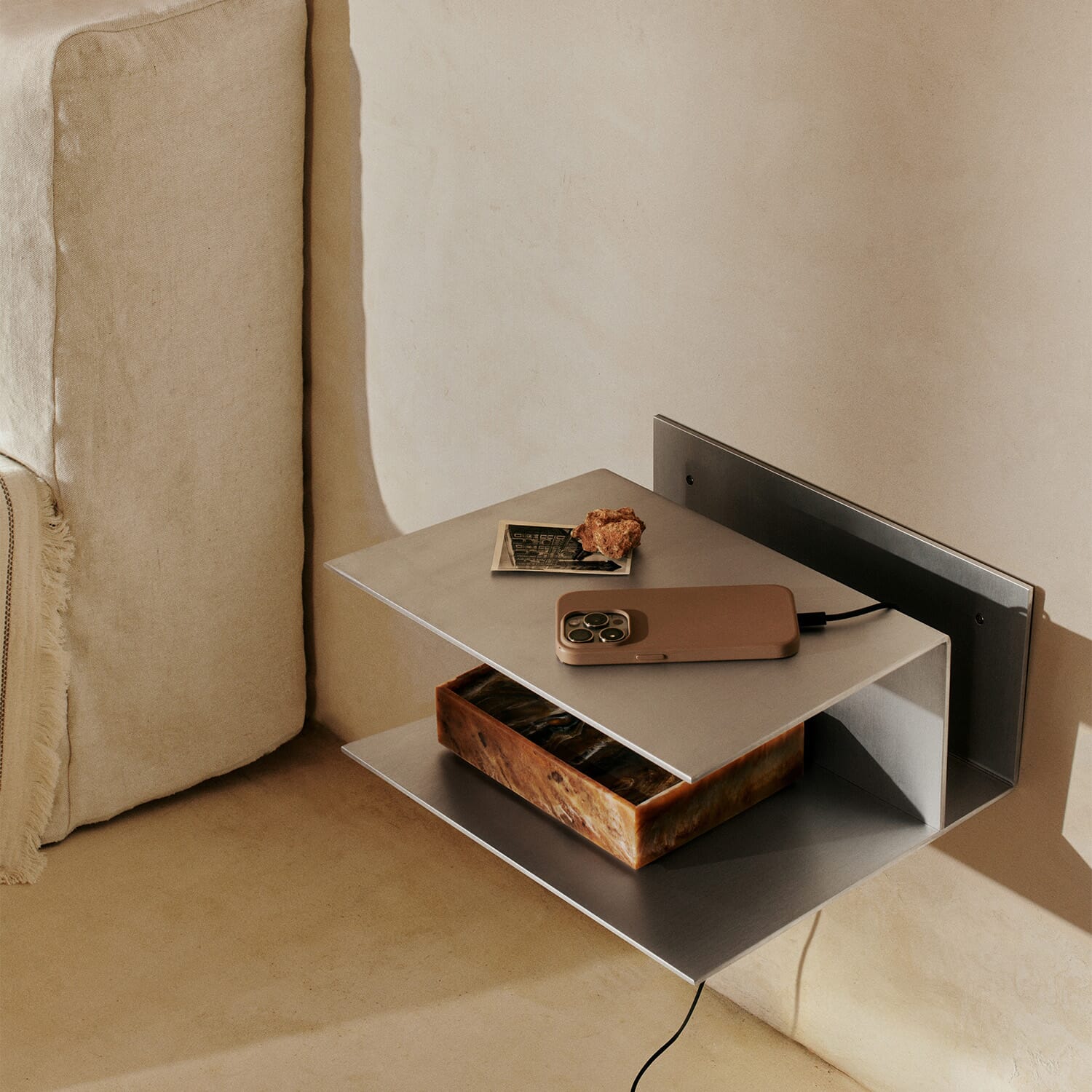 La funksjon møte form med den elegante Lager Bedside Table fra Ferm Living – en veggmontert nattbordsløsning inspirert av brutalismens industrielle estetikk. Med sin minimalistiske silhuett og pudderlakkerte jernoverflate i en varm cashmere-nyanse, tilfører den både karakter og praktisk funksjonalitet til soverommet ditt.