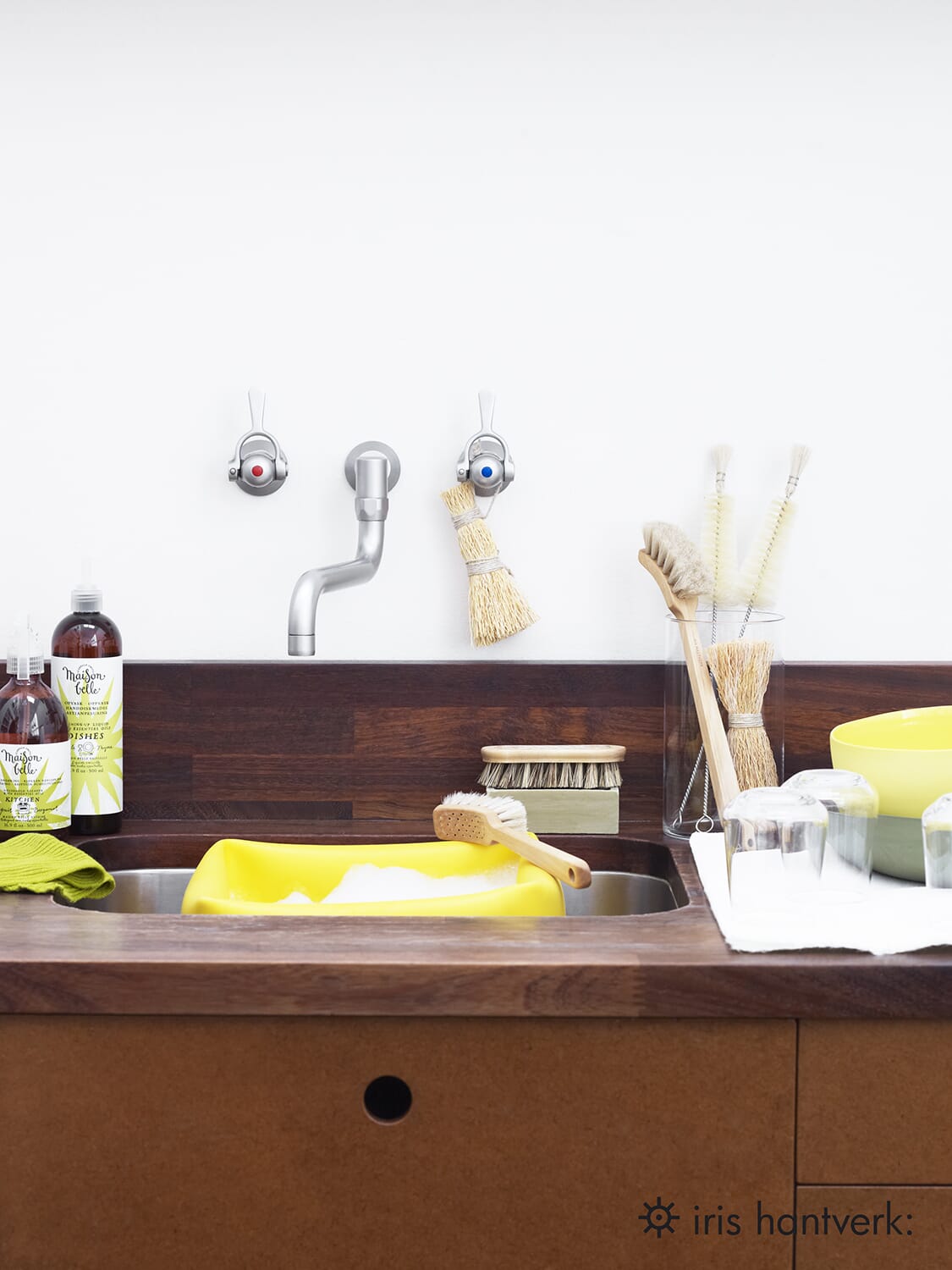 Oppvaskbørste i oljet bjørk med buster av naturlig hestehår. Børstens kurve gjør den ideell for oppvask av glass om bunnen av glasset er vanskelig å nå.