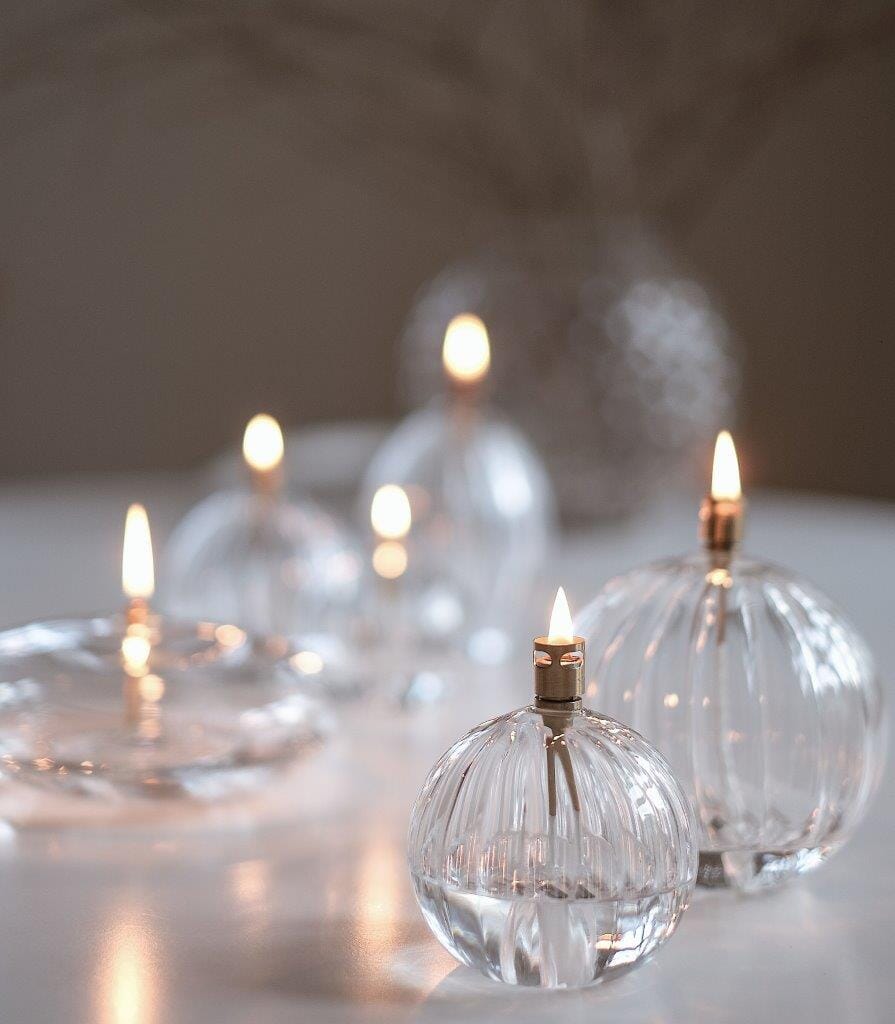 Vakker oljelampe med riller fra Peri Design. Oljelampen er har en lav rund form. Du trenger bare fylle på lampeolje. For å unngå søl når du fyller på lampen, så anbefaler vi å kjøpe trakten i samme serie.