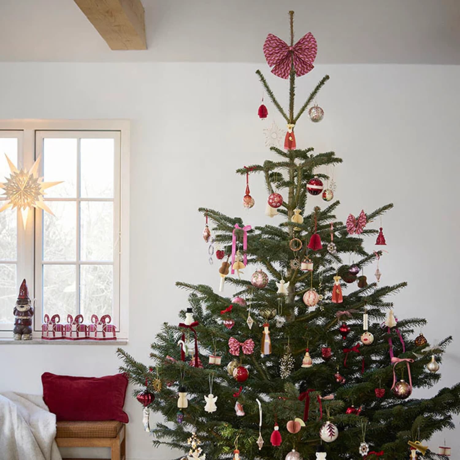 Sløyfen er utstyrt med en liten wire på baksiden, som gjør den enkel å feste på juletregrener, gaver, kranser eller andre dekorasjoner. Den er laget av resirkulert bomullsavfall fra tekstilindustrien, og er både tre-fri og azo-fri – et mer bærekraftig valg uten at det går på bekostning av uttrykk og kvalitet.