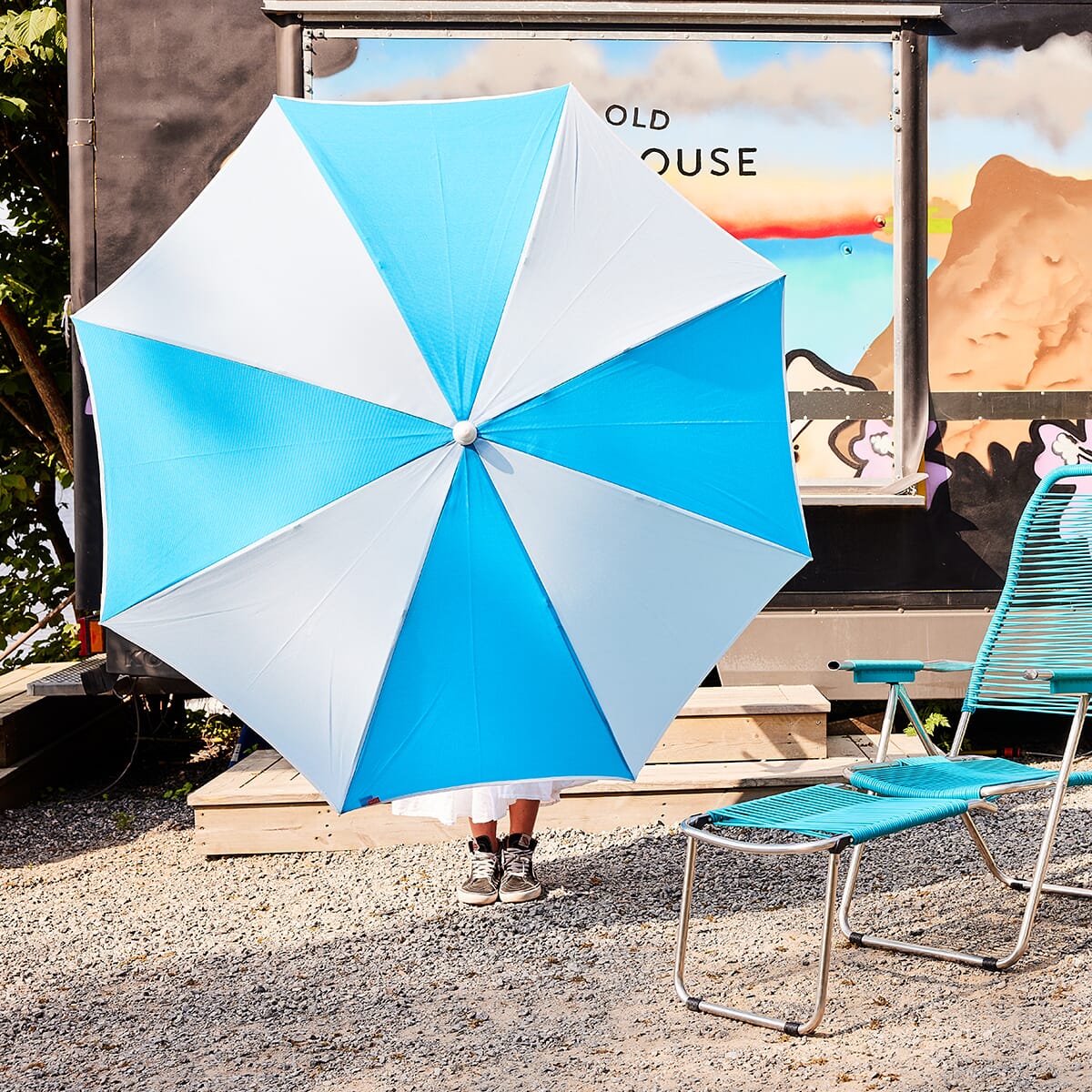 Praktisk og nett parasoll fra Fiam i spreke blåfarger. Parasollen er enkel å ta med seg, enten du skal på stranden, parken eller bare en tur i hagen.