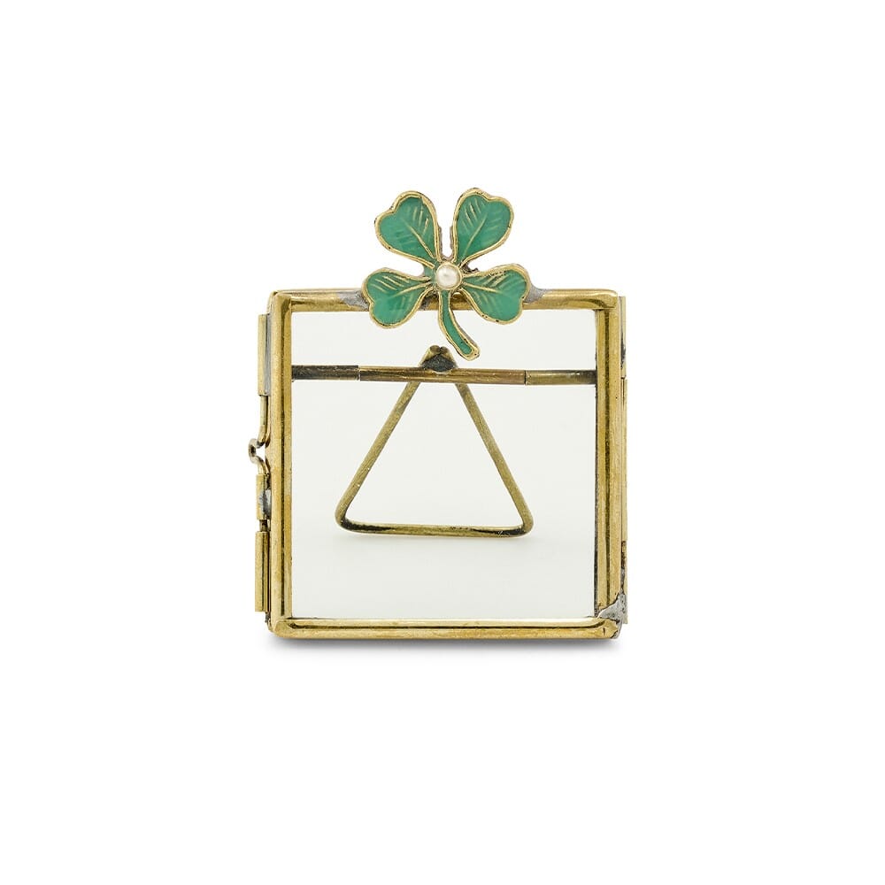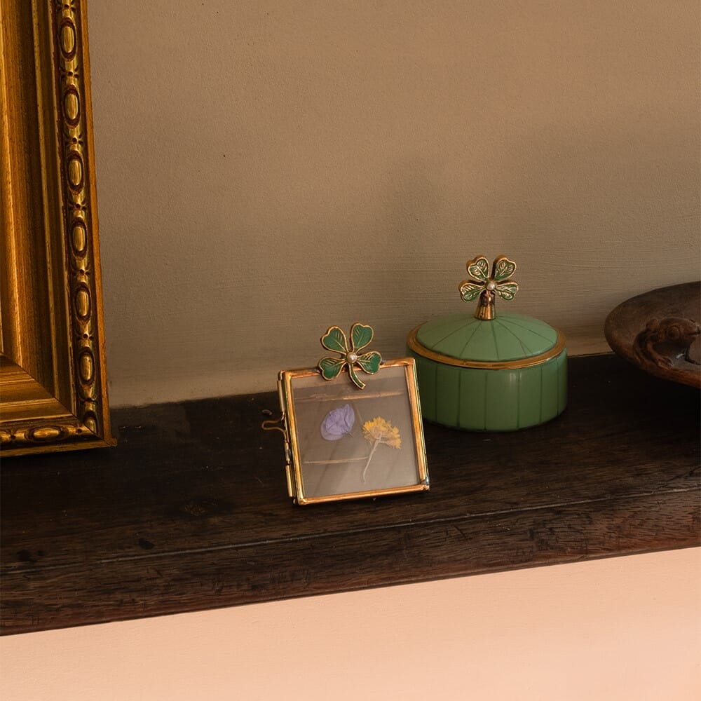 Denne nydelige, håndflatestore rammen er et mesterverk av håndverk, skapt med etisk omsorg av dyktige håndverkere i India, ved hjelp av resirkulert messing og glass. Midtpunktet, en firkløver, er fint innlagt med grønne farger, som symboliserer flaks og fremgang. Enten den står på nattbordet eller hviler på en bokhylle, er denne rammen perfekt for å holde kjære minner nær, og legger til en dose sjarm og eventyr til rommet ditt.
