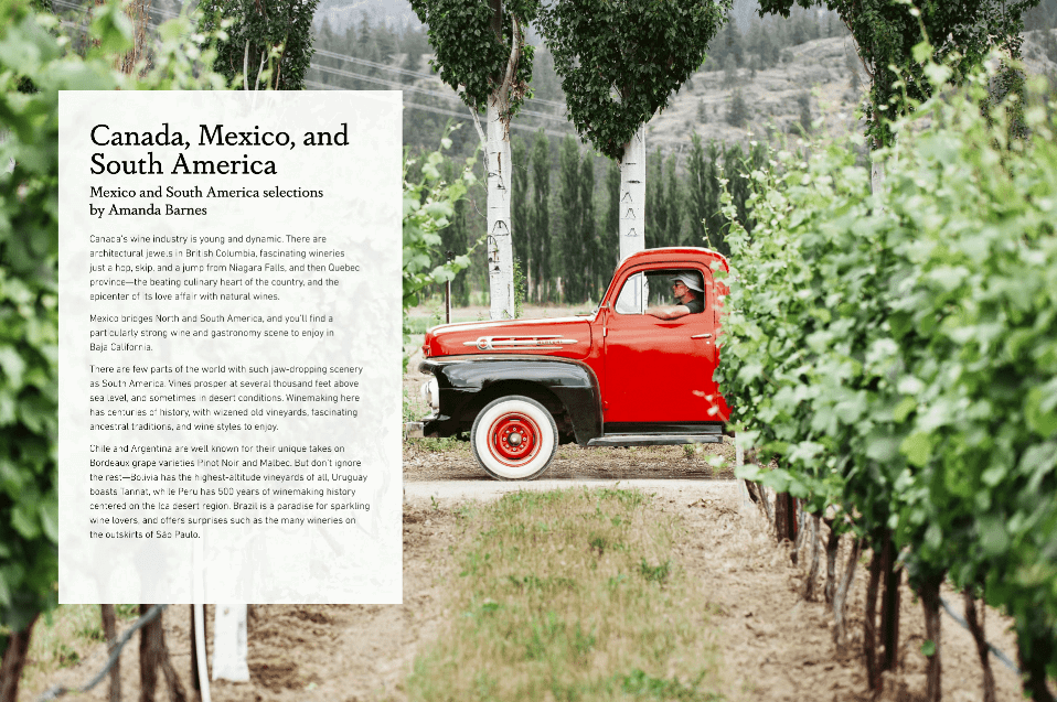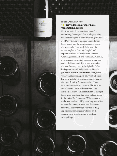 Guiden er skrevet for å fremheve verdens mest givende vindestinasjoner og spenner fra det tradisjonelle til det morsomme og sære. Boken har en rekke forslag til landlige aktiviteter som en sykkeltur i Champagne-regionen eller druetramping i det italienske landskapet, mens andre er mer urbane som omvisning i Wiens sommervinhager eller Romas ikoniske enotecas.