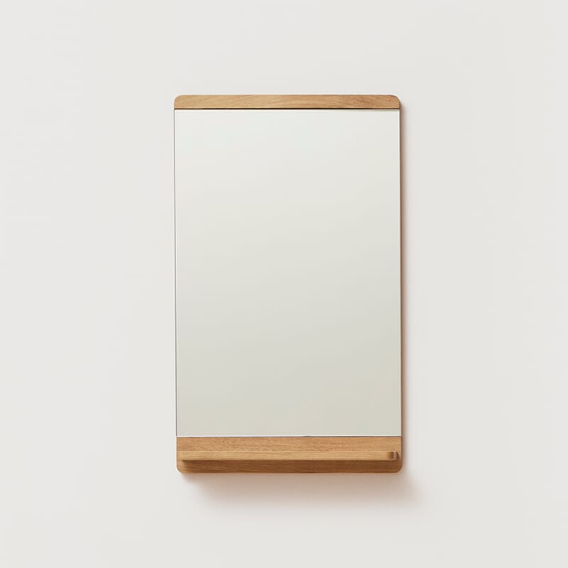 Klassisk, slankt veggspeil laget av Herman Studio for Form & Refine. Det enkle, elegante designet vil passe inn i de fleste oppholdsrom. Det synlige treverket tilføyer litt varme, mens avrundede hjørner på baksiden lager myke skygger.