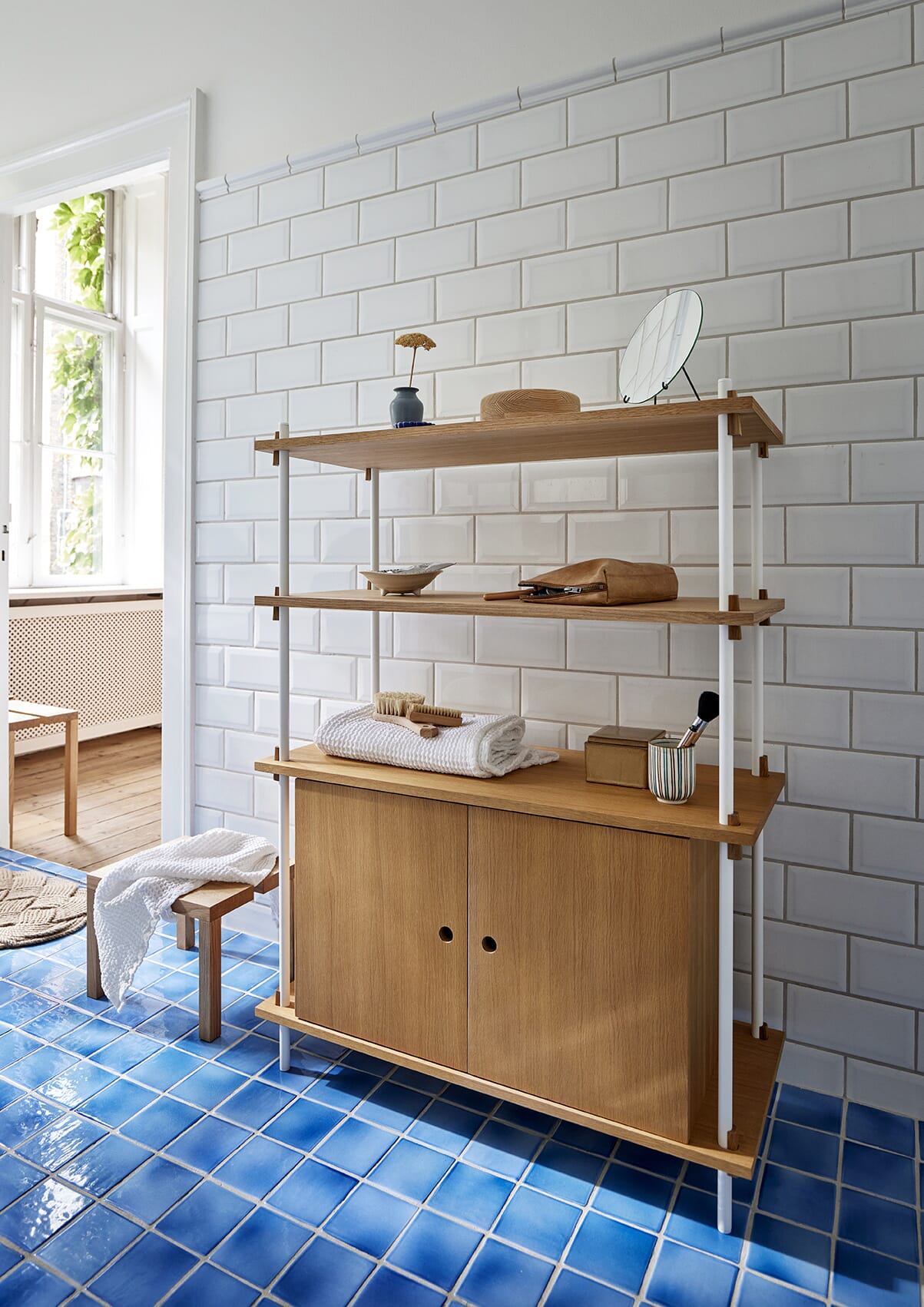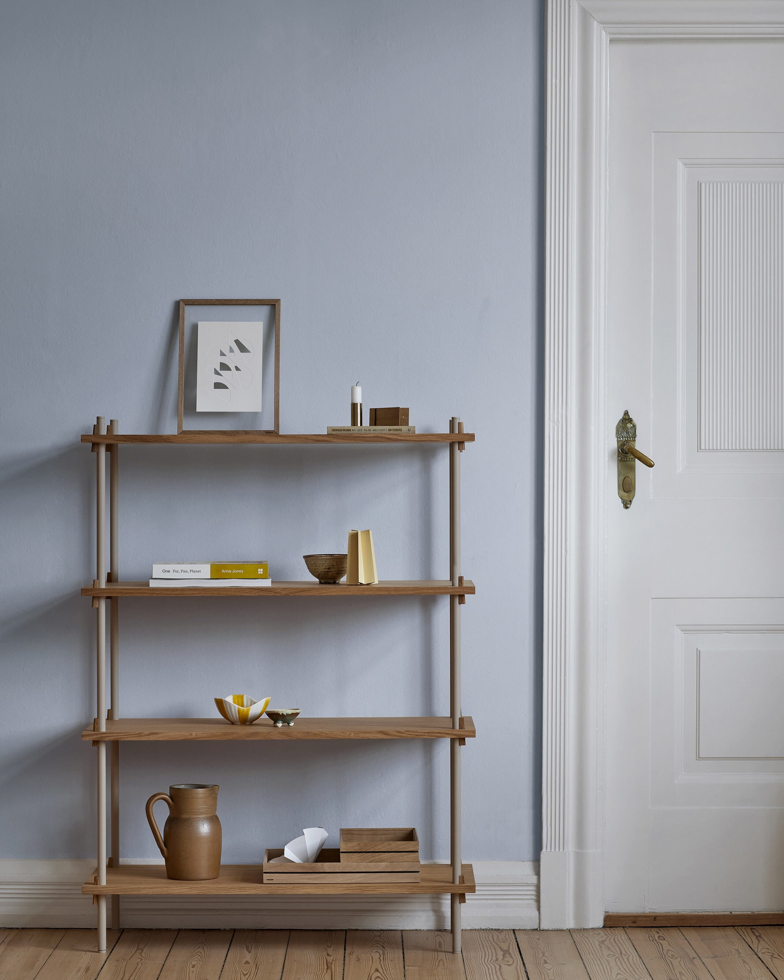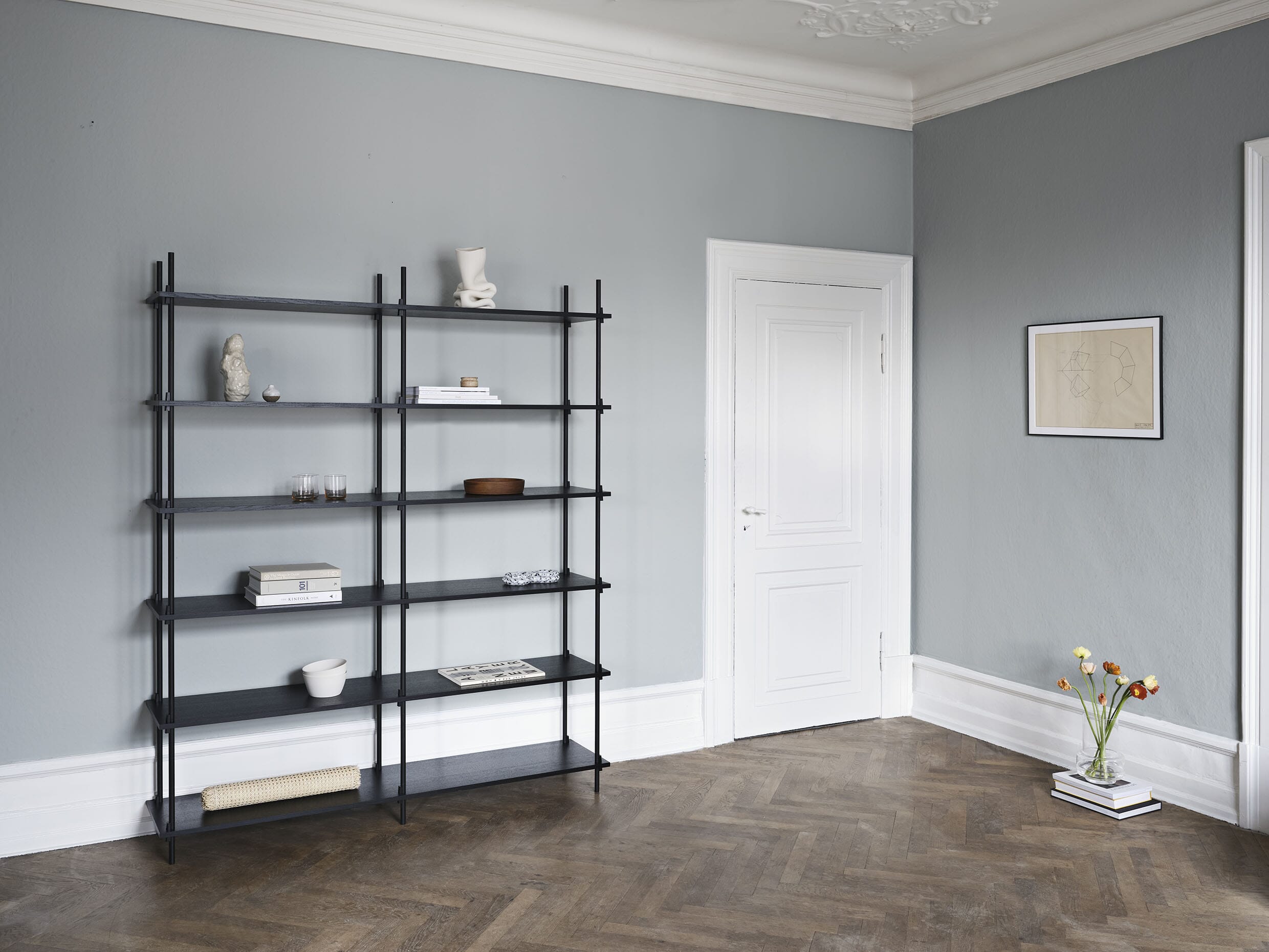 Hyllesystemet fra Moebe gir deg full frihet til å bygge ditt eget møbel som passer akkurat ditt behov. Hylle systemet kan bygges så høyt du vil og så langt du vil, bygg i forskjellig høyder eller rundt hjørner. Den unike konstruksjonen som karakteriserer systemet gjør at du selv kan bestemme om systemet skal brukes som romdeler eller mot en vegg, og kilene som holder hyllene på plass gjør at du selv bestemmer høyden på hver enkelt hylleplate.