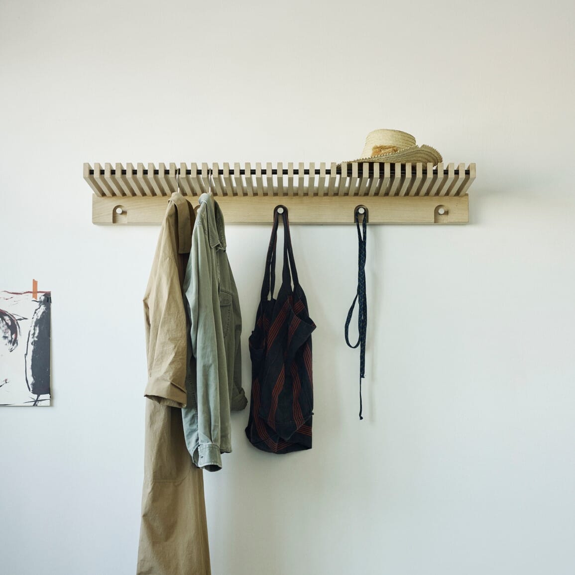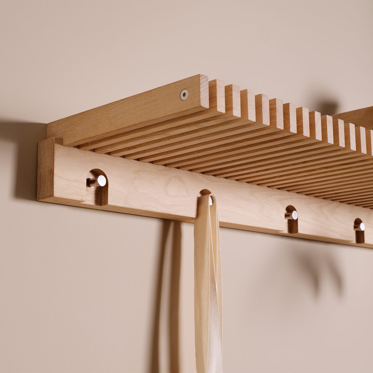 Cutter hattehylle har et stilrent design, og til tross for sitt minimalistiske utseende kan den oppbevare store mengder klær. Møbelet er en alt-i-ett løsning for hattehylle, henger for hengere og fem kroker.