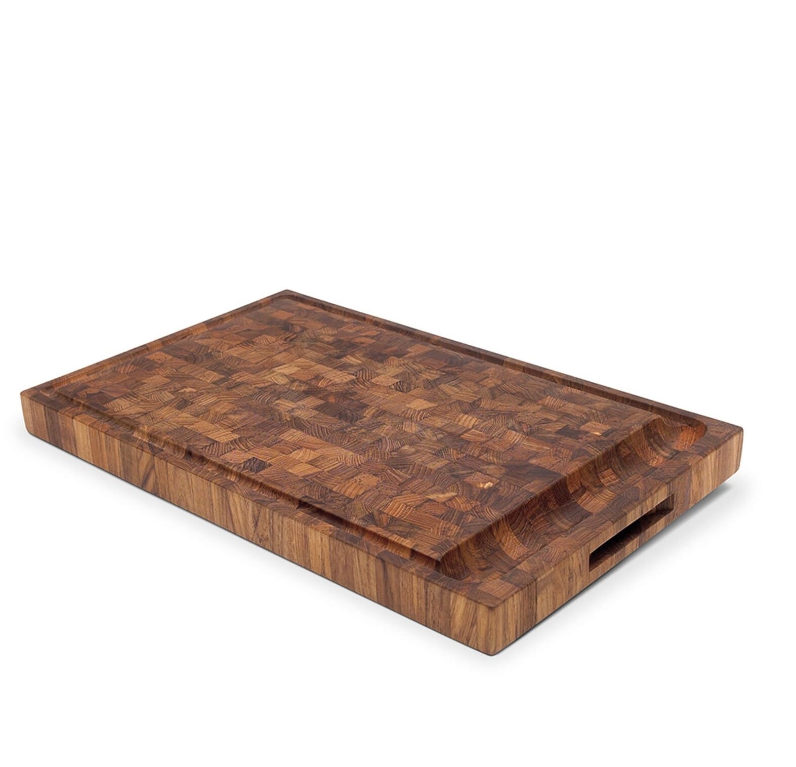Teak inneholder naturlige oljer som er motstandsdyktige mot fukt og bakterier, og de oppadgående fibrene absorberer støtet fra knivbladene. Dette sikrer en lang levetid - både til brettet og kniven. Dania har praktiske håndtak på hver ende og en renne som samler veske og smuler.