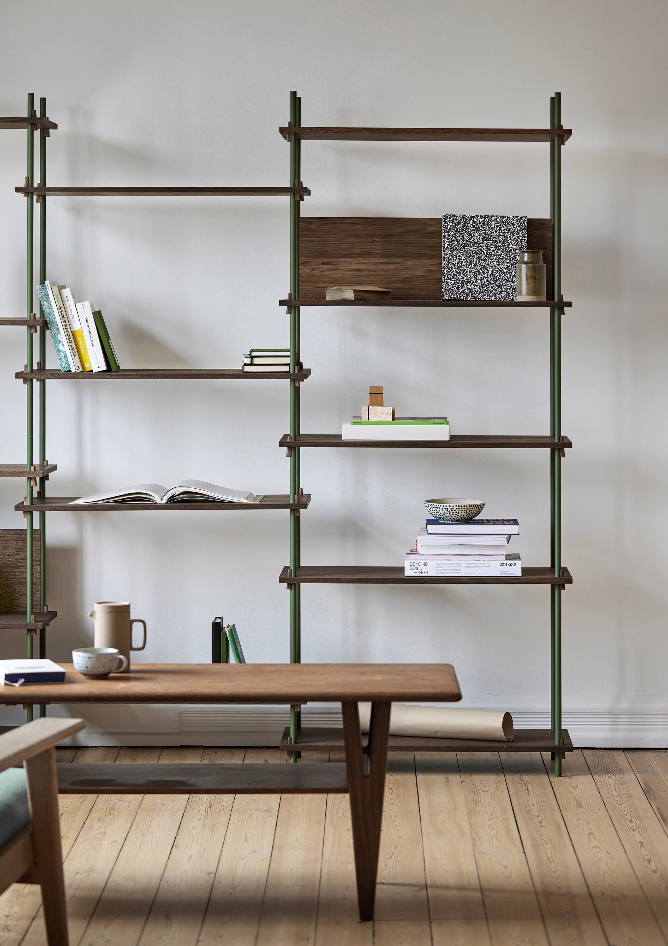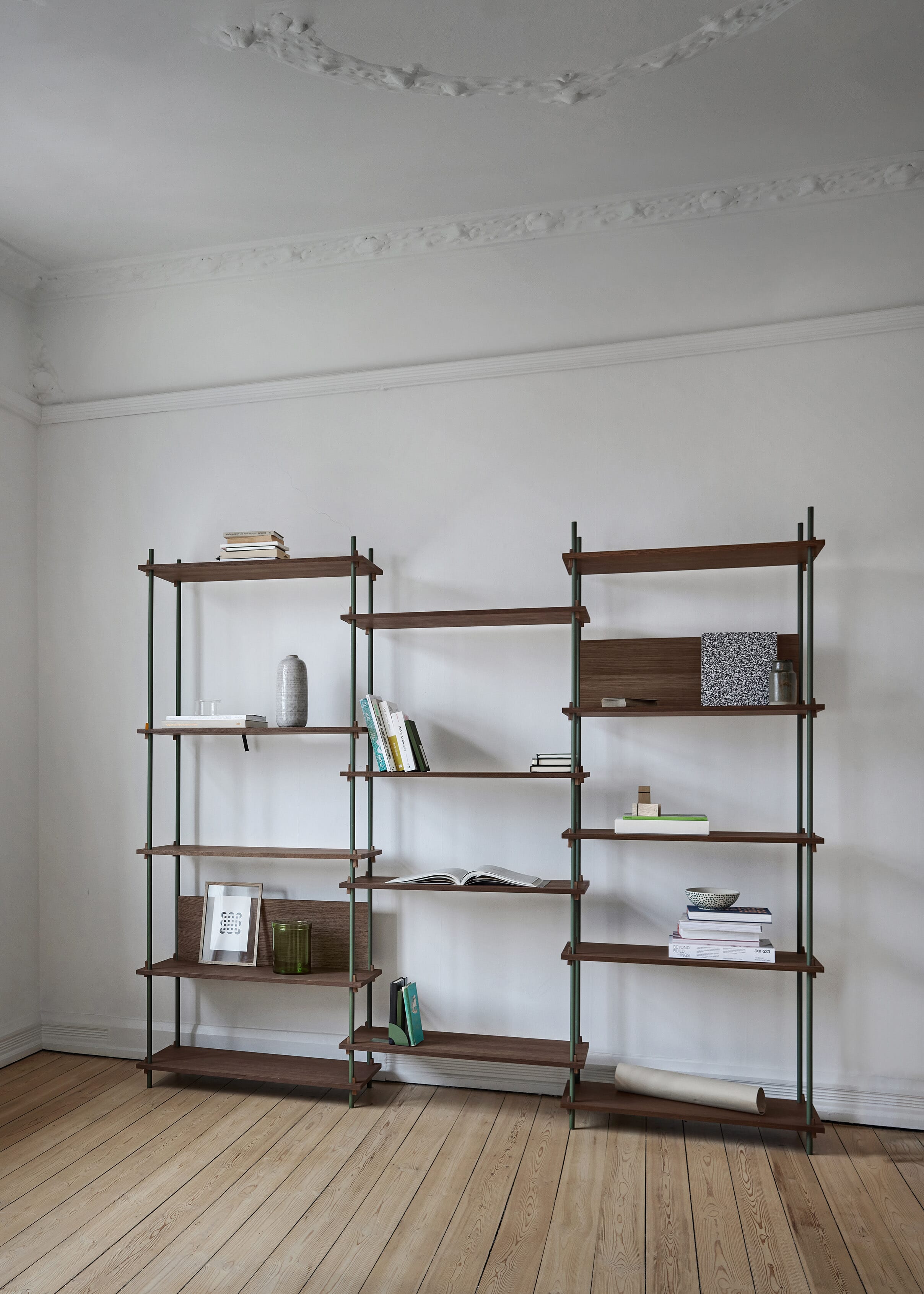 Hyllesystemet fra Moebe gir deg full frihet til å bygge ditt eget møbel som passer akkurat ditt behov. Hylle systemet kan bygges så høyt du vil og så langt du vil, bygg i forskjellig høyder eller rundt hjørner. Den unike konstruksjonen som karakteriserer systemet gjør at du selv kan bestemme om systemet skal brukes som romdeler eller mot en vegg, og kilene som holder hyllene på plass gjør at du selv bestemmer høyden på hver enkelt hylleplate.
