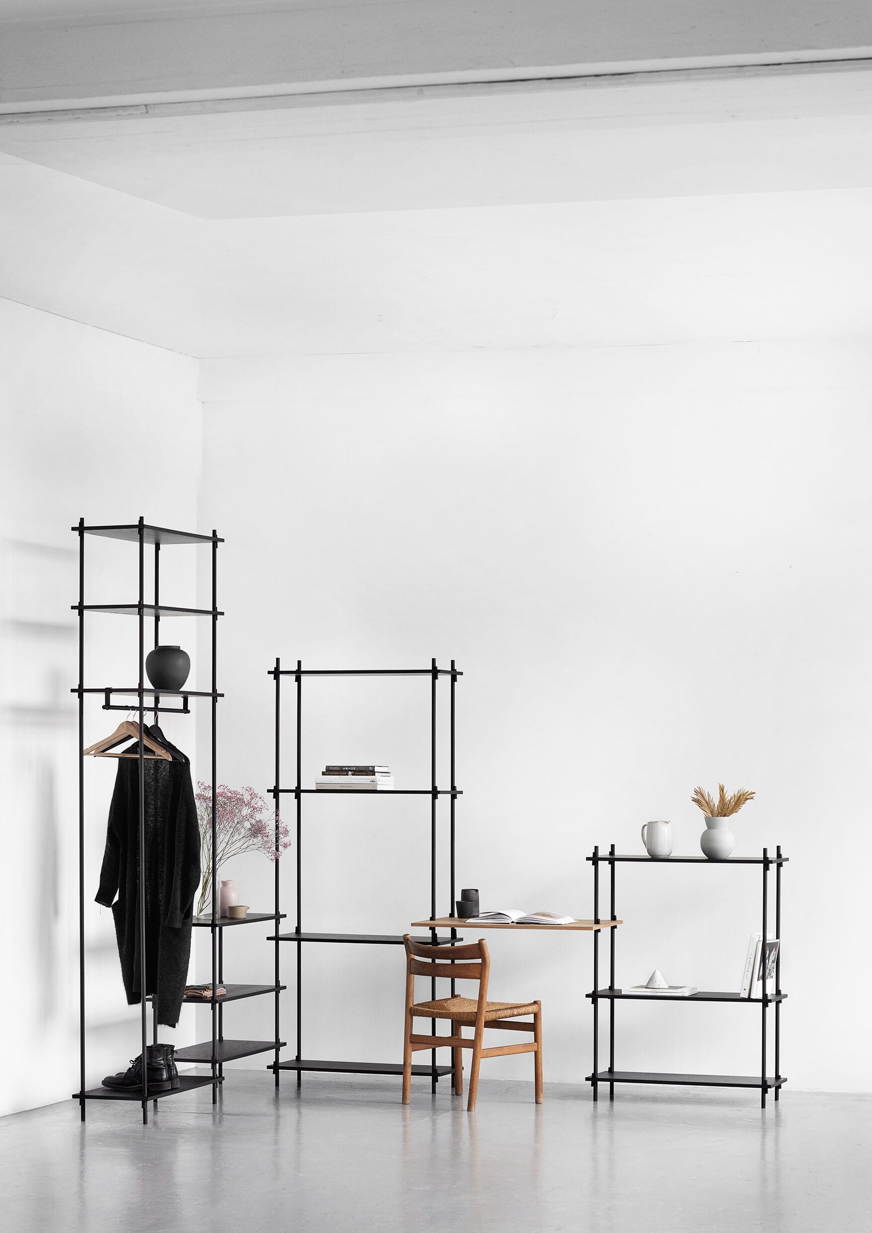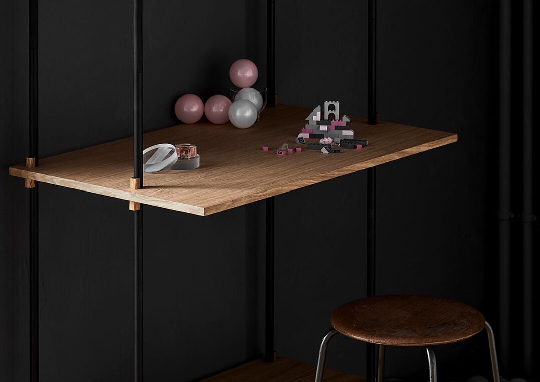 Hyllesystemet fra Moebe gir deg full frihet til å bygge ditt eget møbel som passer akkurat ditt behov. Hylle systemet kan bygges så høyt du vil og så langt du vil, bygg i forskjellig høyder eller rundt hjørner. Den unike konstruksjonen som karakteriserer systemet gjør at du selv kan bestemme om systemet skal brukes som romdeler eller mot en vegg, og kilene som holder hyllene på plass gjør at du selv bestemmer høyden på hver enkelt hylleplate.