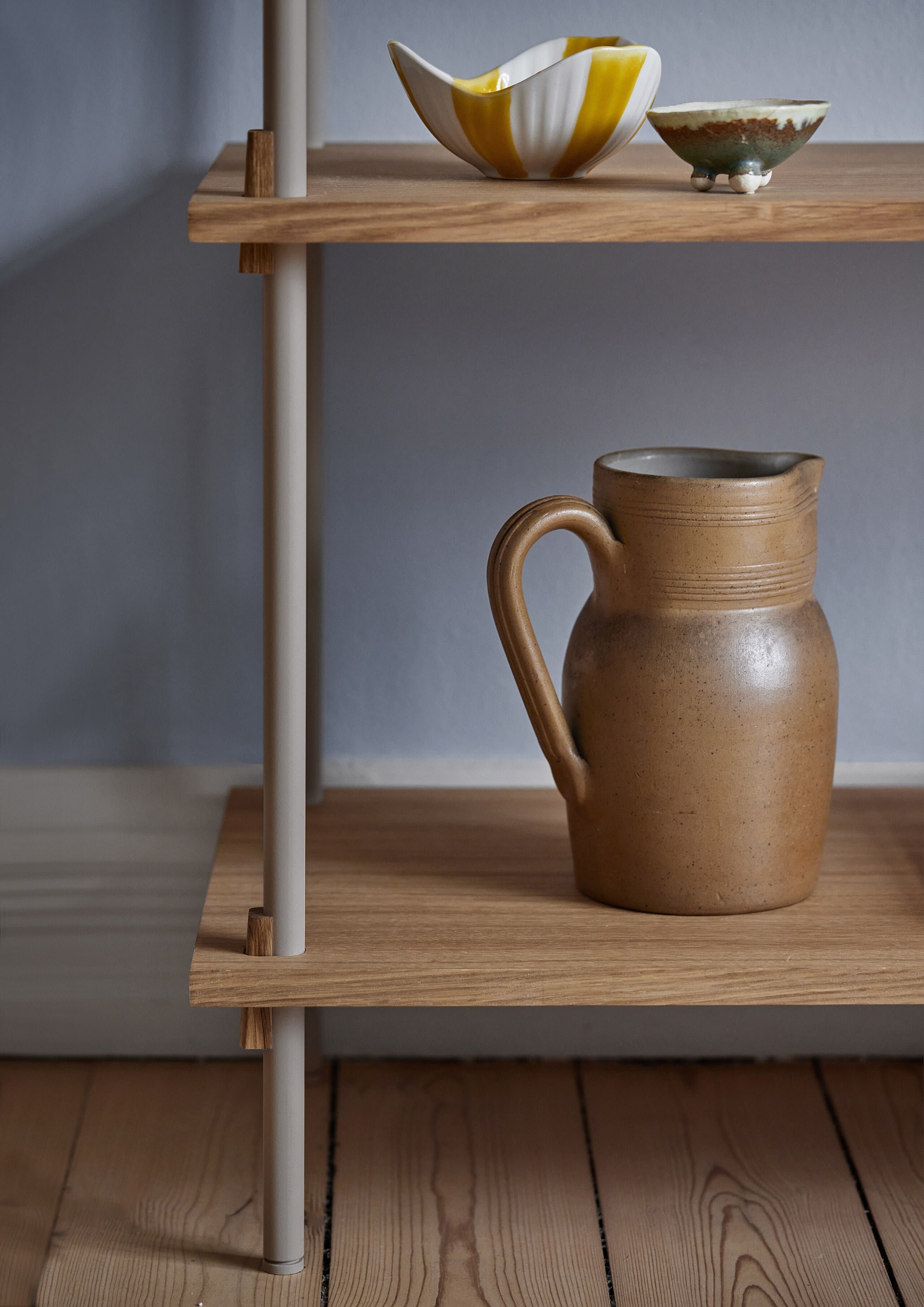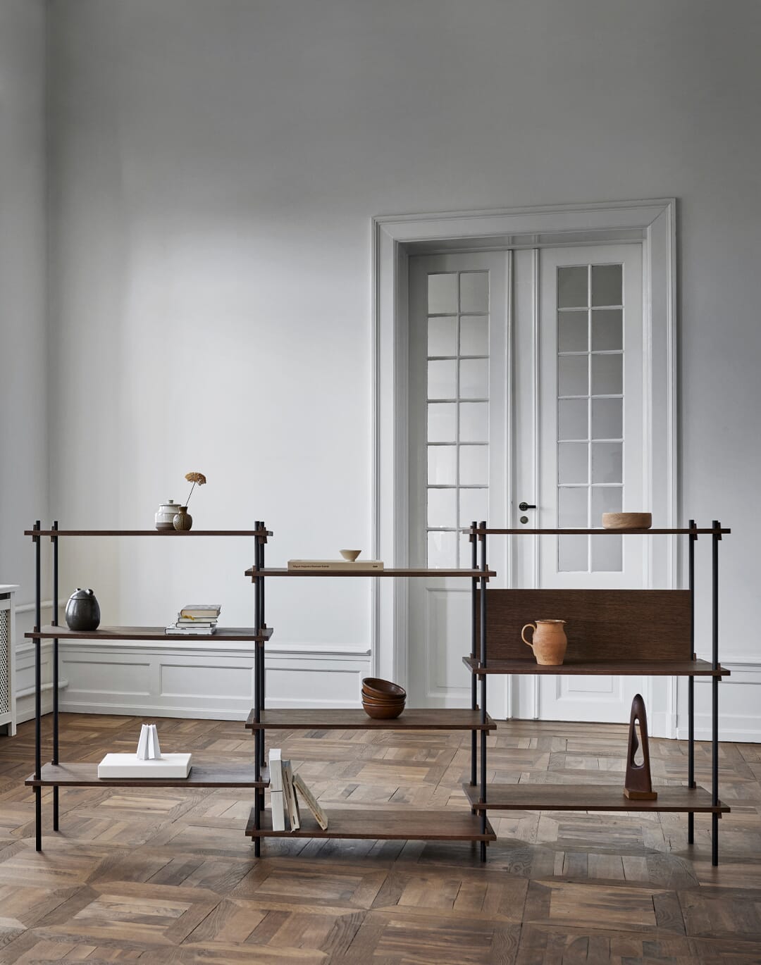 Hyllesystemet fra Moebe gir deg full frihet til å bygge ditt eget møbel som passer akkurat ditt behov. Hylle systemet kan bygges så høyt du vil og så langt du vil, bygg i forskjellig høyder eller rundt hjørner. Den unike konstruksjonen som karakteriserer systemet gjør at du selv kan bestemme om systemet skal brukes som romdeler eller mot en vegg, og kilene som holder hyllene på plass gjør at du selv bestemmer høyden på hver enkelt hylleplate.