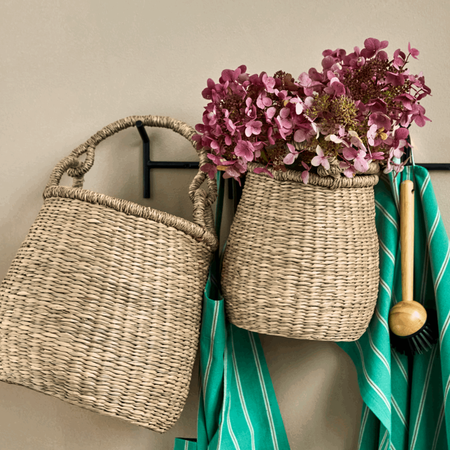 Settet består av to kurver i ulike størrelser, begge utstyrt med praktiske håndtak som gjør dem enkle å flytte rundt. Perfekte til alt fra oppbevaring av kjøkkentekstiler og garnnøster til blader, leker eller rengjøringsartikler. Kurvenes tekstur og naturfarge gjør dem ikke bare funksjonelle, men også dekorative elementer i rommet.