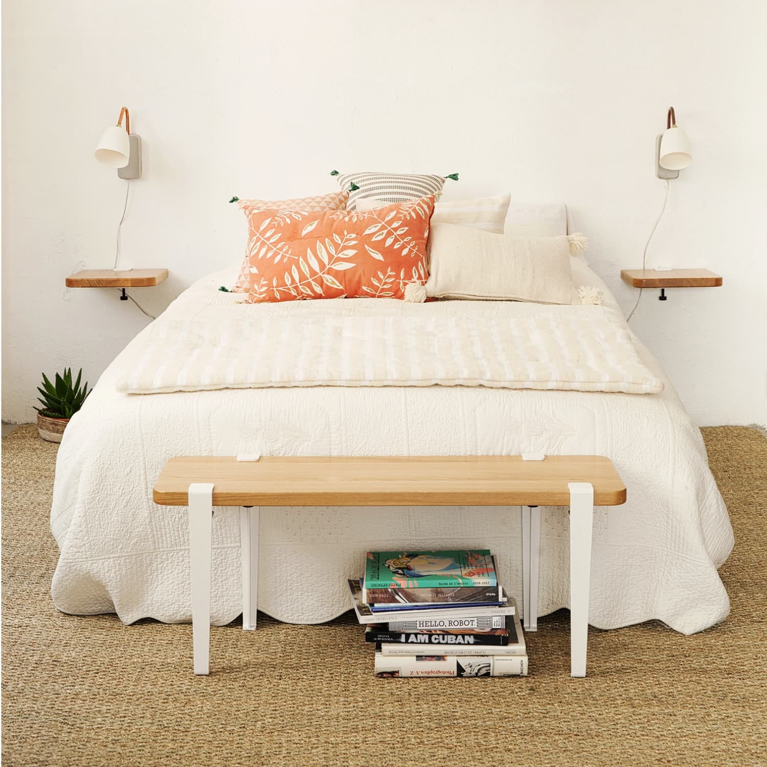 Hyllen består av en solid eikeplate (45 × 20 cm). Kompatibel med én brakett, som kjøpes separat. Monter den enkelt på veggen og bruk den som nattbord eller vegghylle til dekor, bøker, lampe eller som praktisk avlastningsplass – alt etter behov og rom.