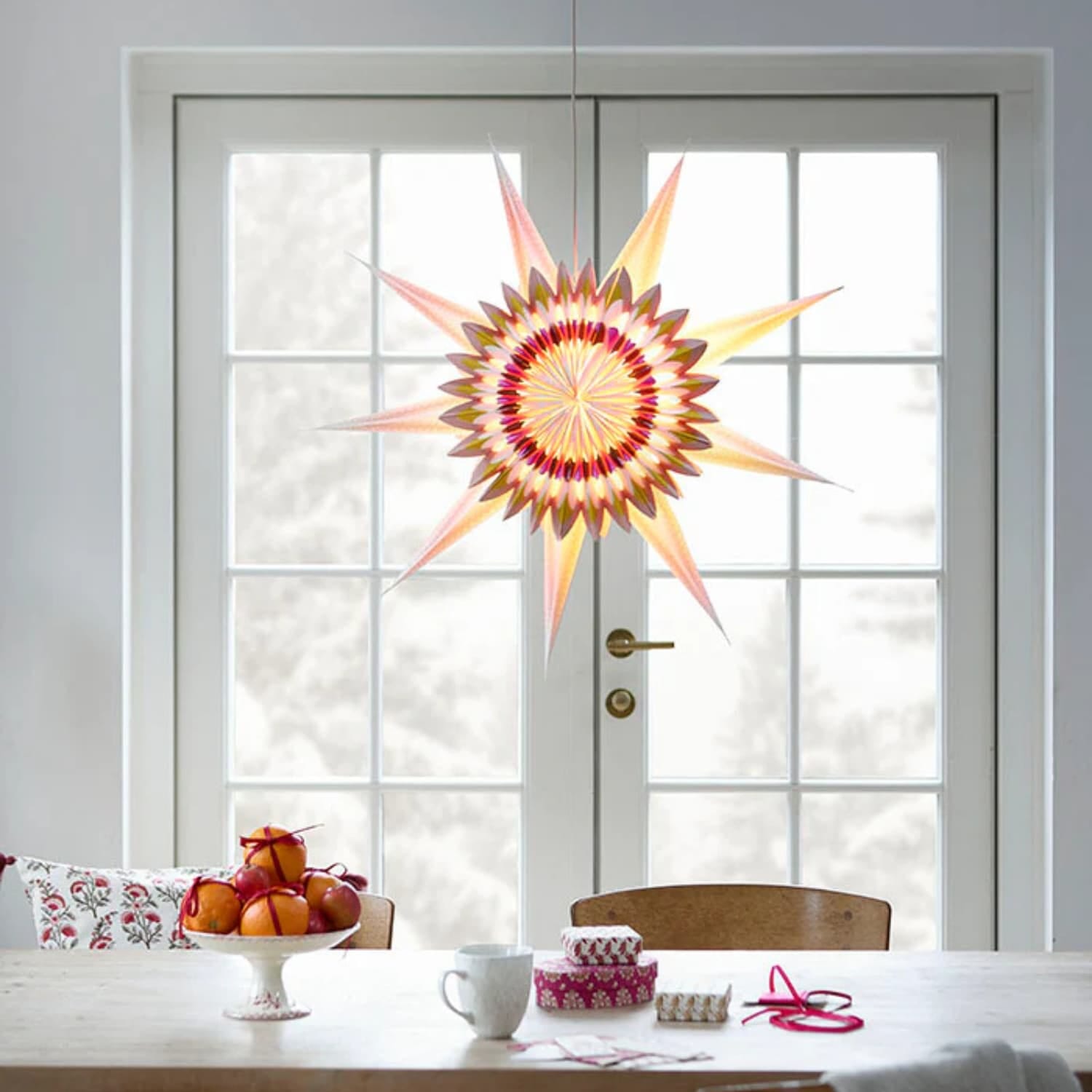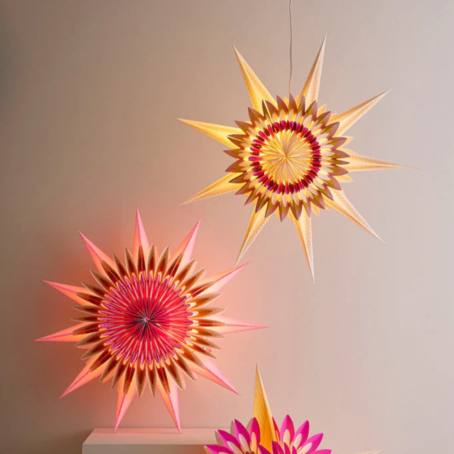 Papirstjerne Helios Gold Ø70 cm er en storslått og stemningsskapende stjerne som gir hjemmet et varmt og festlig preg.